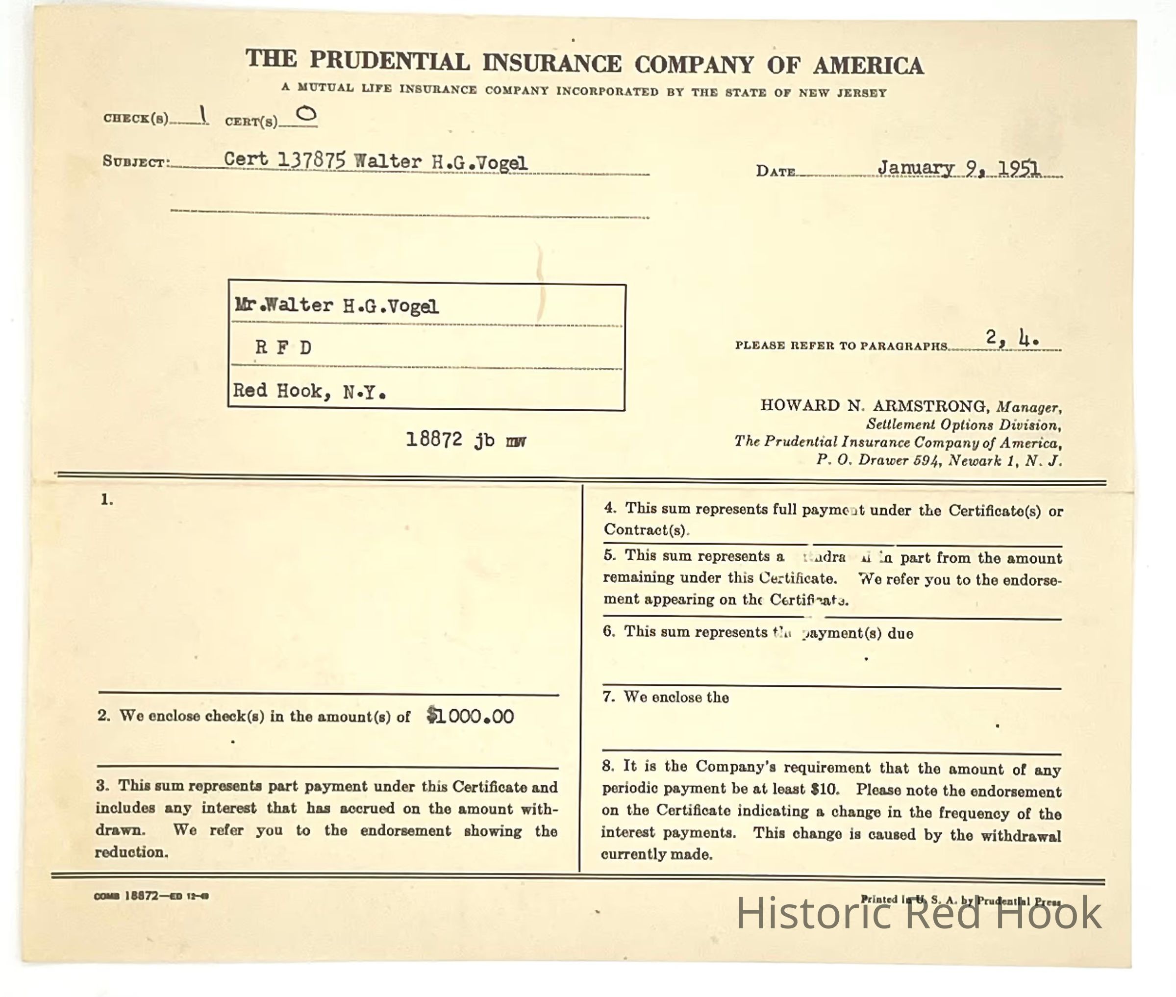 Receipt for check of $1000 sent to Walter Vogel from The Prudential Insurance Company of AmericaCollection