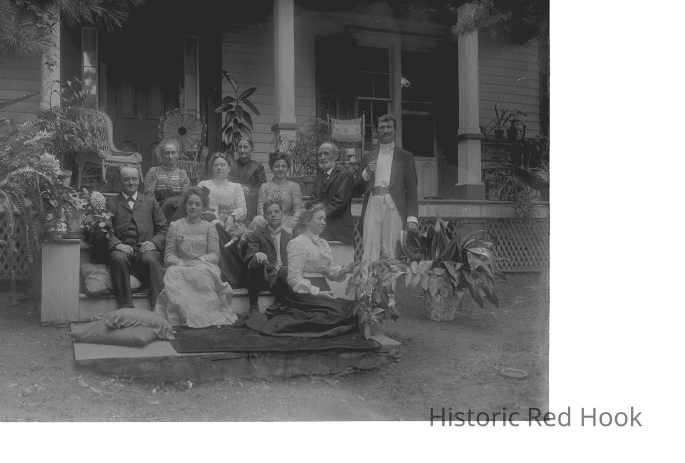 Description from 2017.005.172 - Group photograph seated on & standing near the front steps of the porch identified as Vosburgh house and family c. 1904 listing back to front and left to right - Mr. Burke, a friend; George Vosburgh; Fannie Vosburgh Coon; Grandmother, Marie Proper; Ellen Vosburgh; Henrietta Vosburgh Myers; Katharine Vosburgh; ? French; Minnie C. Vosburgh; Ed Vosburgh... Vosburgh Home, East Kerley Corners Road.Photograph Details