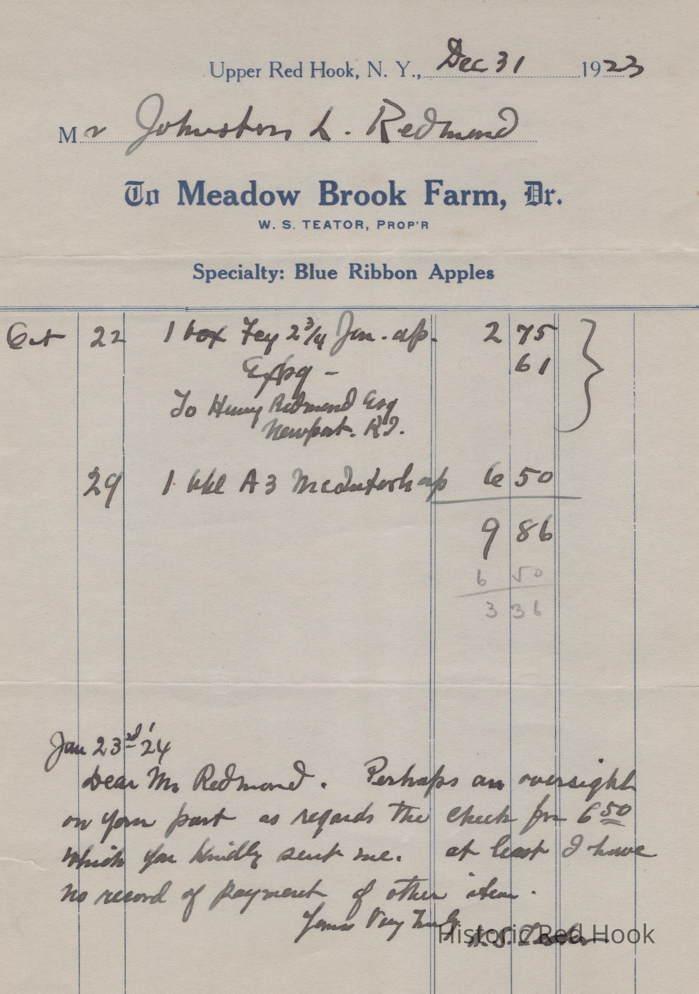 A receipt from W. S Teator to Johnston L. Redmond dated December 31, 1923 addressing a missing payment.,Relationships