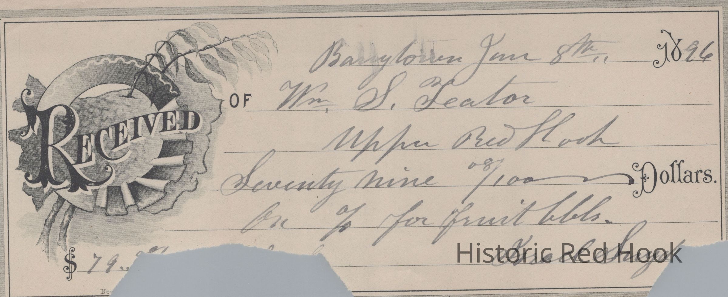 A receipt for Wm. S. Teator from Israel Snyder for payment of $79.08 for fruit barrels dated JAN. 8TH, 1896.Relationships