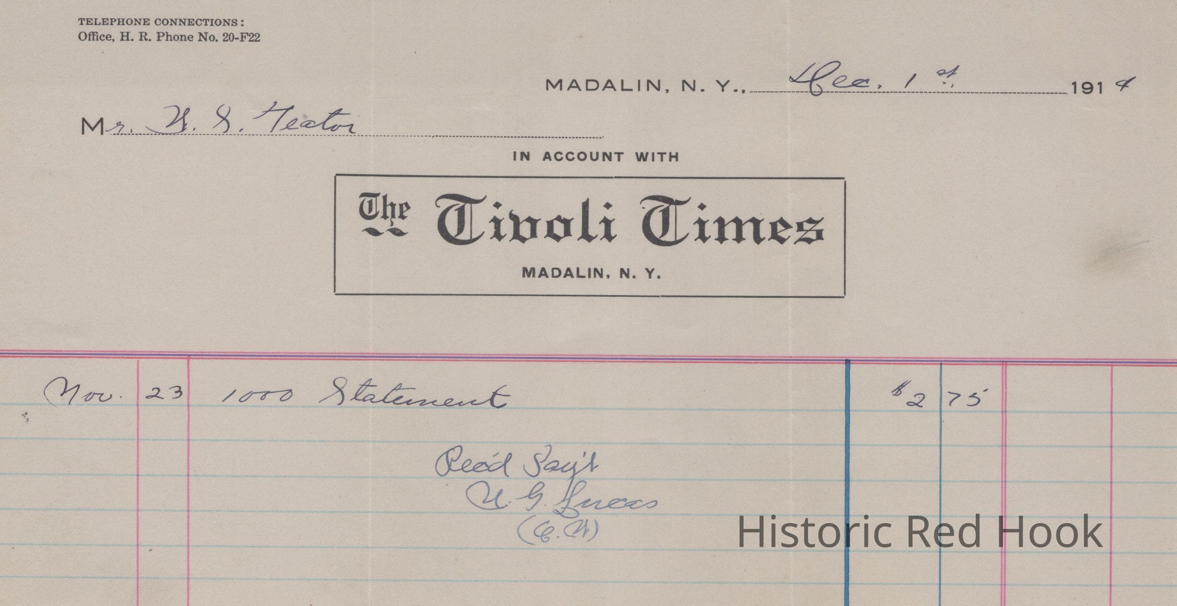 December 1, 1914 receipt to W. S. Teator from The Tivoli Times, Madalin, New York for the November 23 Statement.Relationships