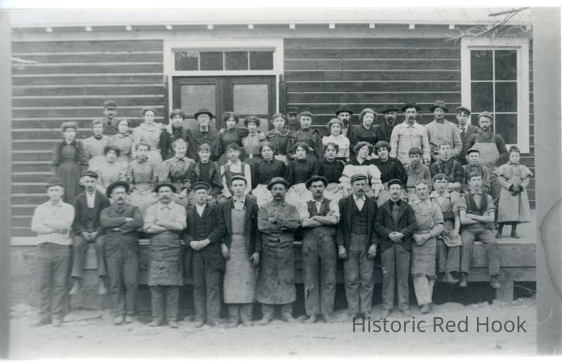 Factory workers posed in front of original W. H. Baker Chocolate Co. building at Cedar Hill in Annandale, 1890s. Color photocopy of original print and black & white copy of print. Harold Griffing is second from right (back) with tie and cap.Photograph Details