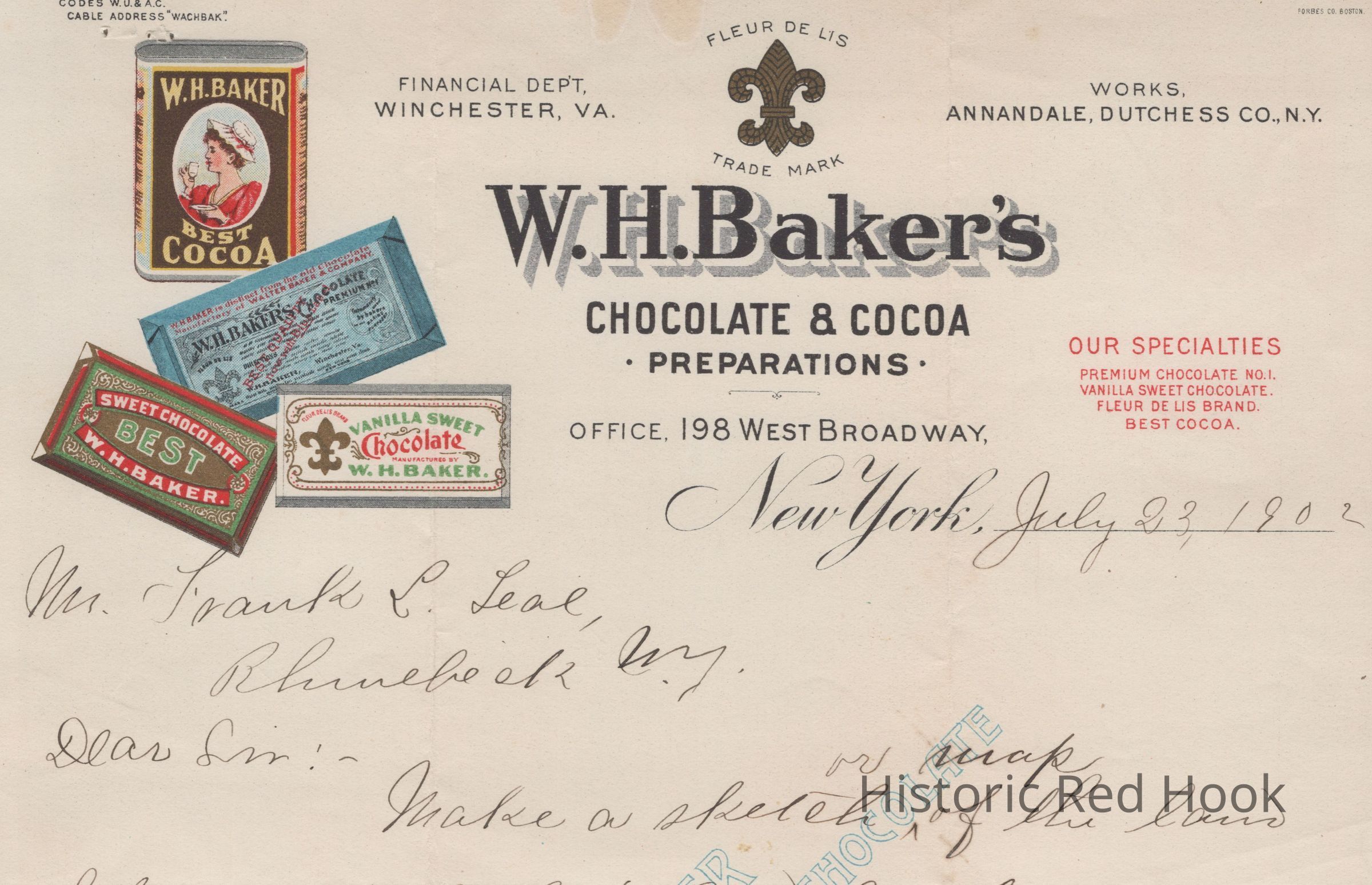 W.H. Baker's Chocolate Factory letter, July 23, 1902, addressed to Frank L. TealRelationships