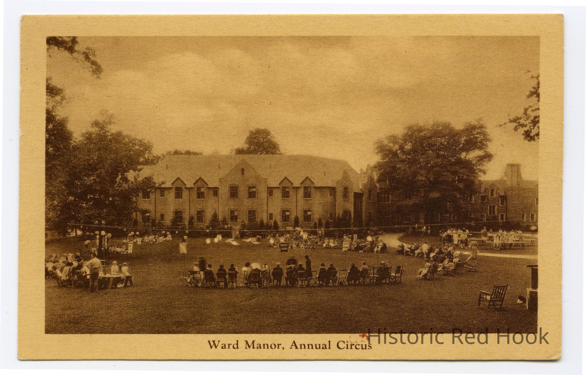 A gathering of people sitting outside of a large building, Ward Manor, in the hamlet of Annendale, NY in the town of Red Hook, NY. A banner for "Sunset Lodge" is present.Subject Place