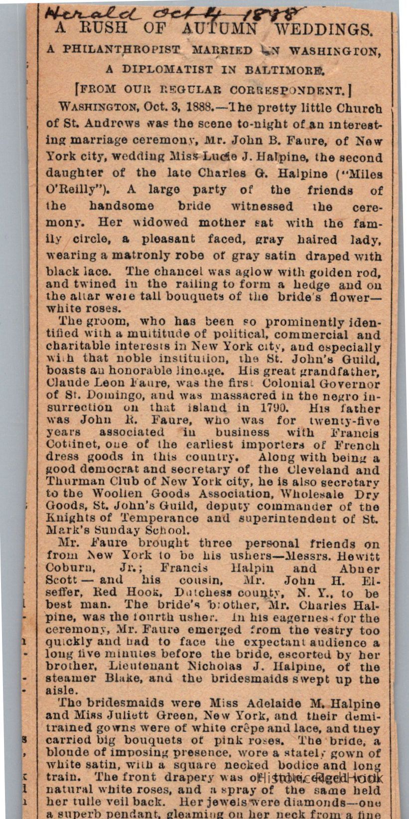 Wedding announcement of Mr. John B. Faure and Miss Lucie J. HaplineEntry/Object ID