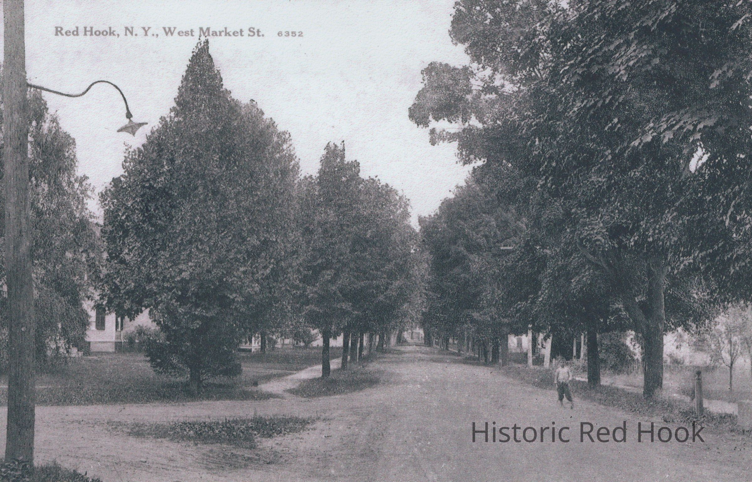 View of West Market St in the Village of Red Hook, NY, looking west down tree-lined unpaved road. Date unknown. Copy of postcard imageCollection