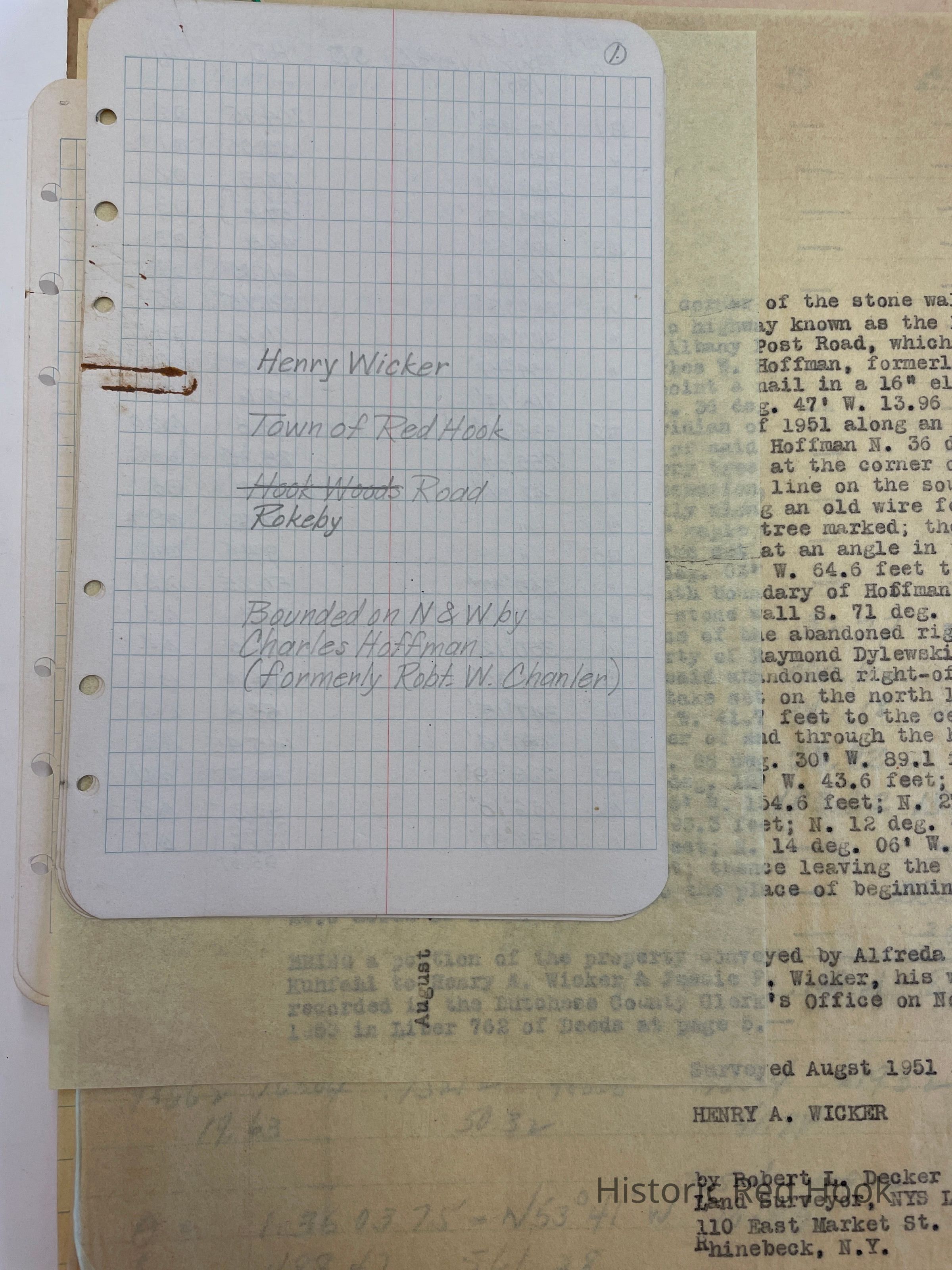 Survey: For Henry A. Wicker Aug 1951 24.0 Acres. Being a portion of property conveyed by Alfreda MacMurray Kuhfahl to Henry Wicker 762:5 22 Nov 1950