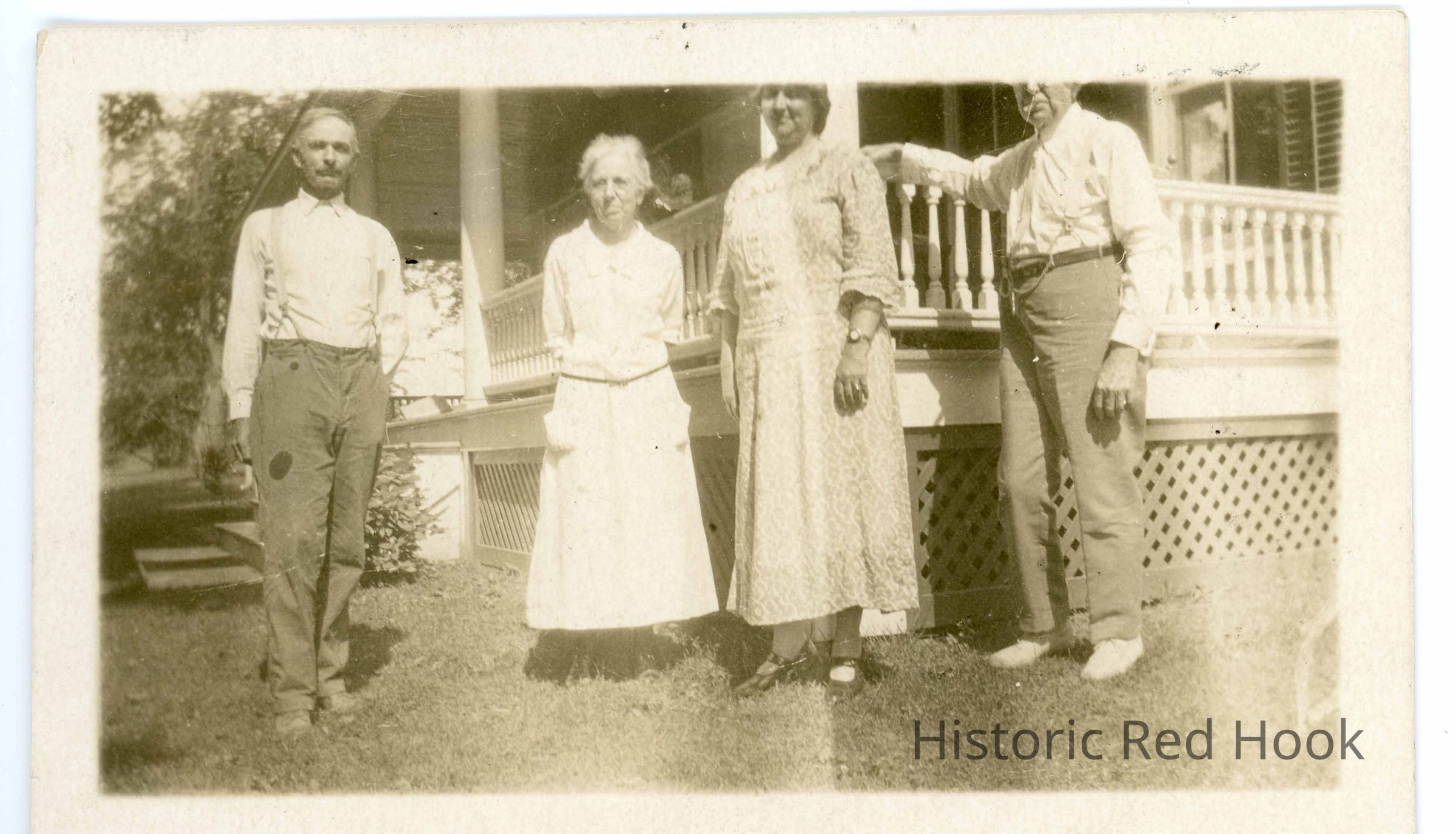 Group of two men and two women standing in front of a porch. Three have been identified as William and Nina Teator and possibly Theodore Weeks.Photograph Details