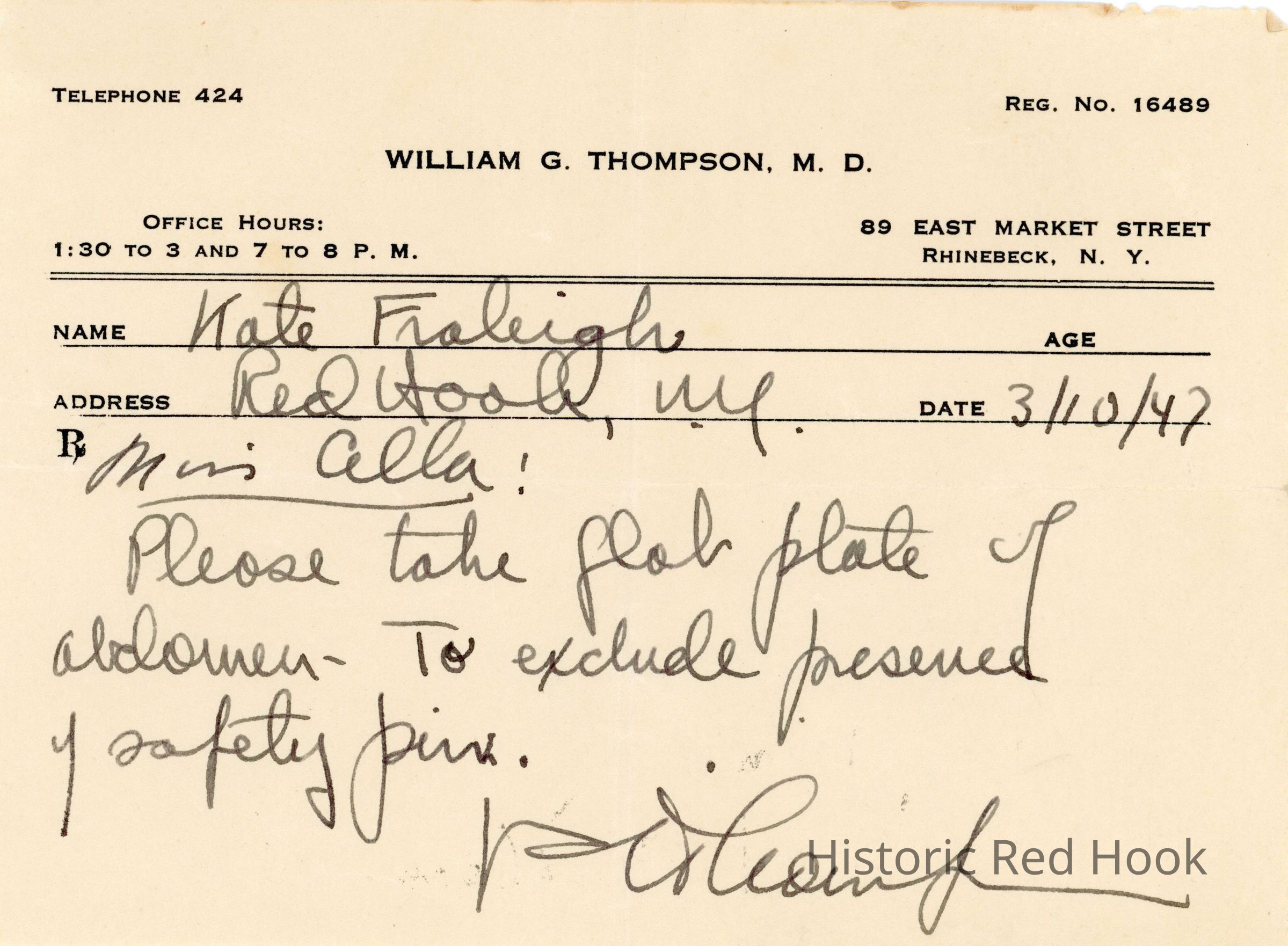 An order from Dr. William G. Thompson for an x-ray to exclude the presence of a safety-pin for Kate Fraleigh, dated March 10, 1947.Relationships
