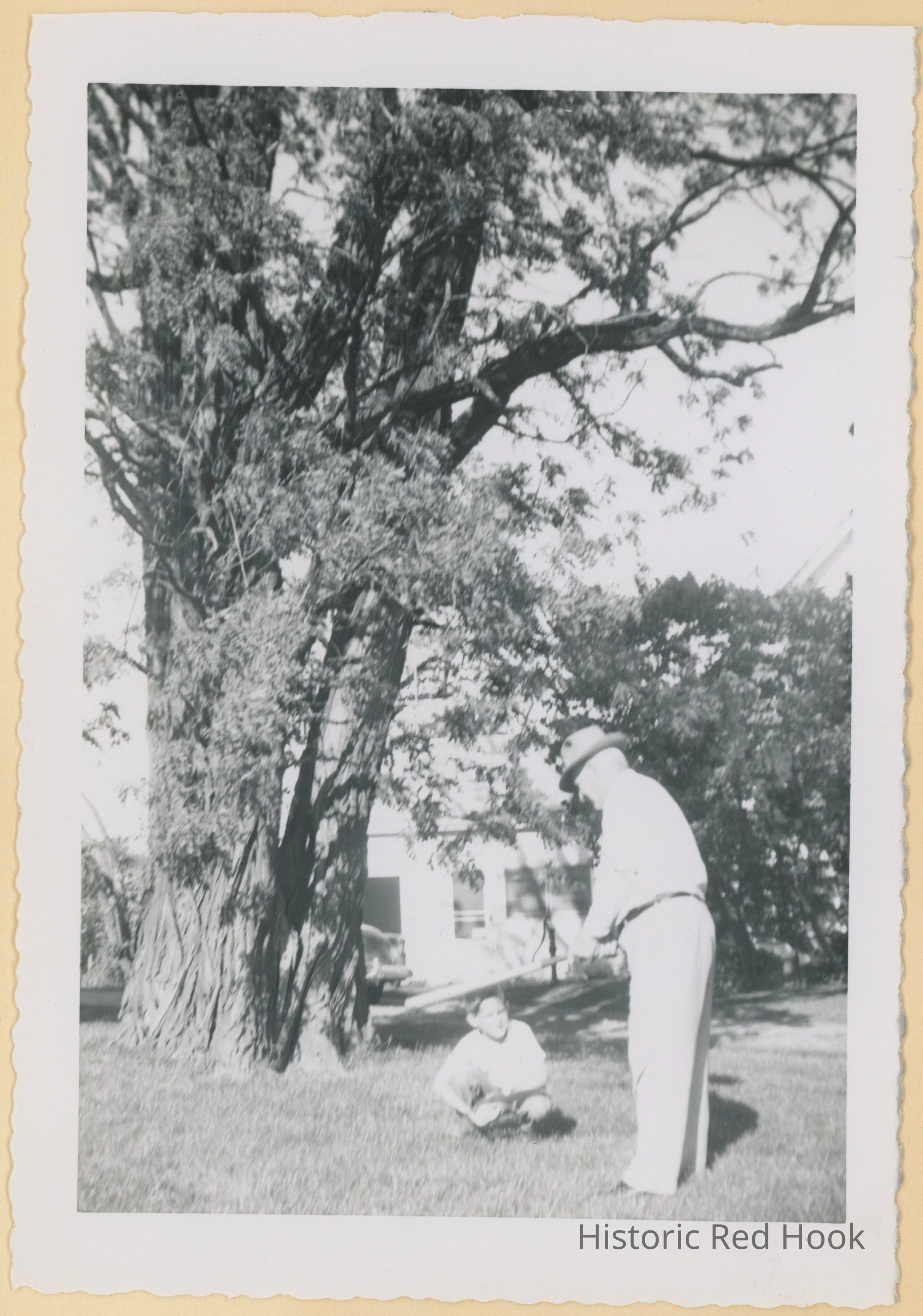 William Redder, owner of Heermance Farm, and grandson, Pete, on lawn next to locust tree.Photograph Details