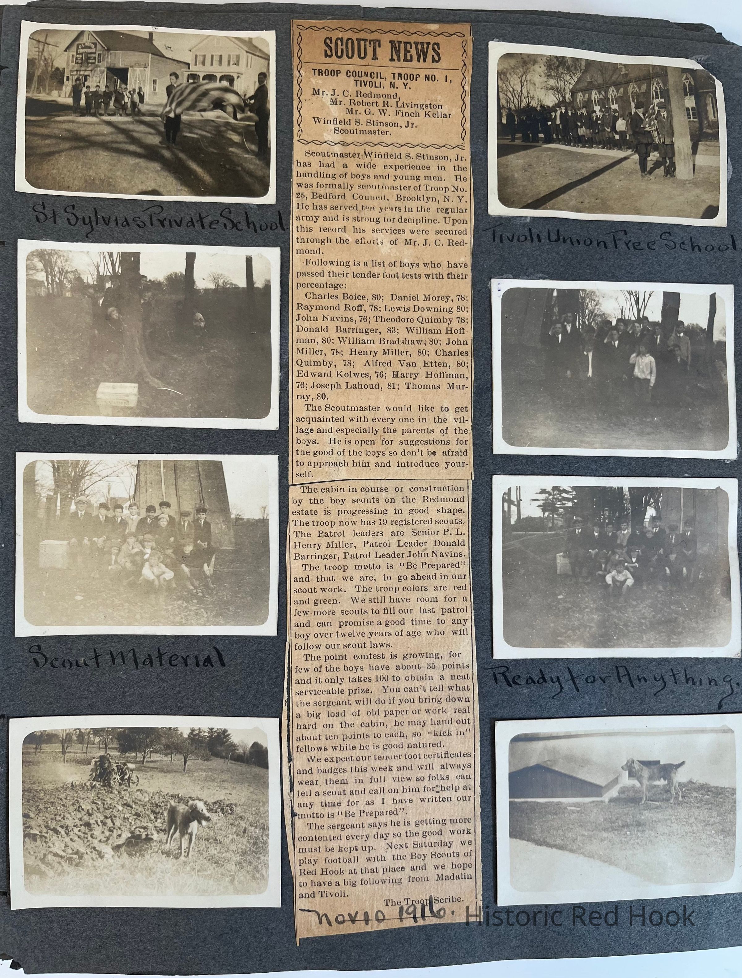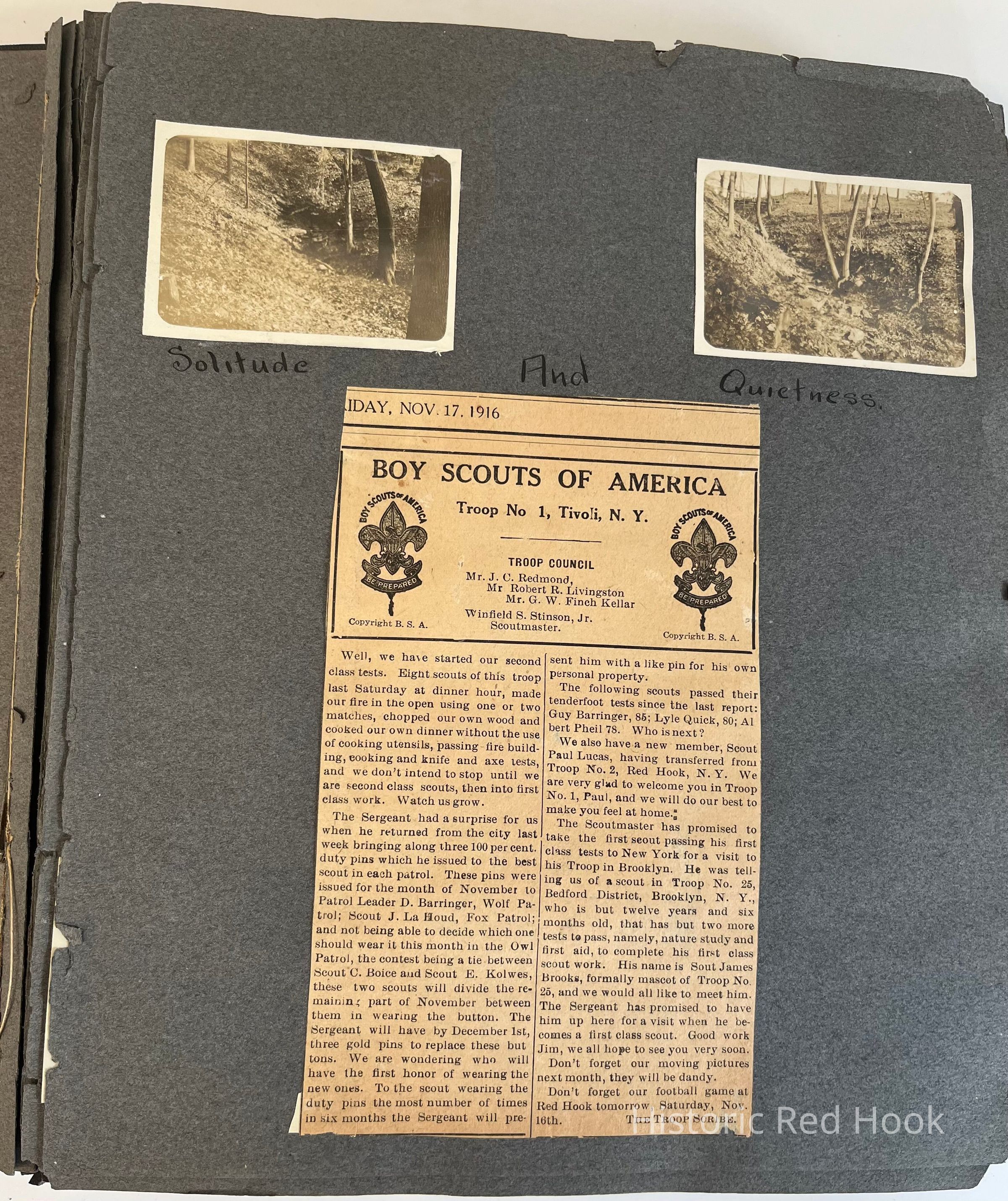 Scrapbook, in fragile condition, with photos, newsletters and clippings assembled by Winfield S. Stinson, Jr. who founded Tivoli's first Boy Scout troop in 1916. The Troop Council included Mr. J. C. Redmond, Mr. Robert R. Livingston, Mr. G. W. Finch Kellar. It covers the period 1916-1918.
