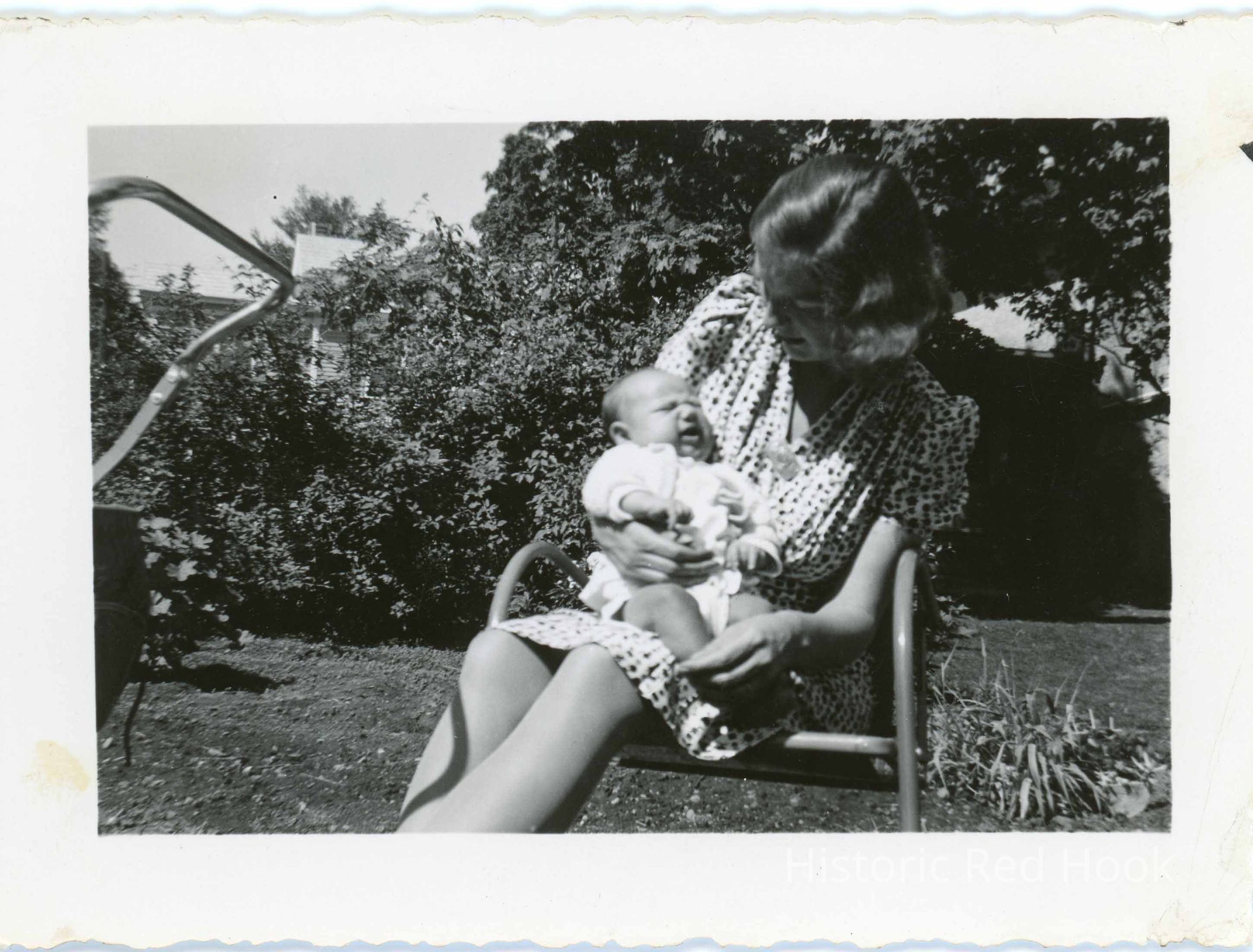 Photograph of a young woman seated in a lawn chair holding a baby June 1939