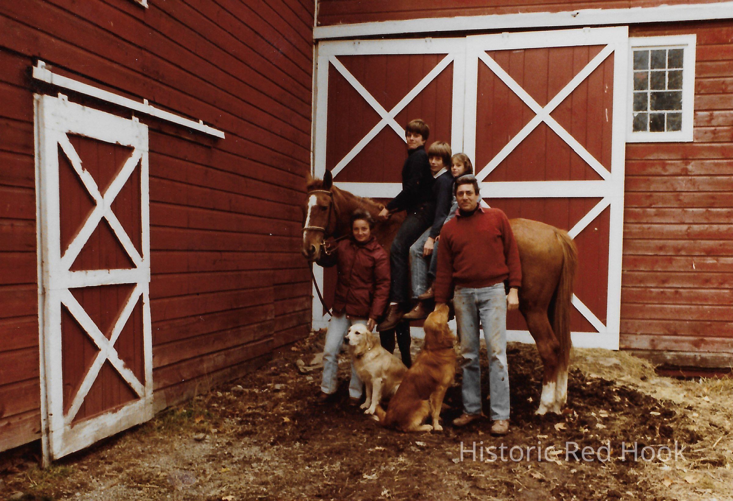 Peter, Nicky and Elizabeth atop Brandy, reined in by Tibbie and guarded by Woody and golden retrievers Bridget (l) and Basil, standing at the junction of the hay barn (rear) and its adjoining, smaller barn.Photograph Details