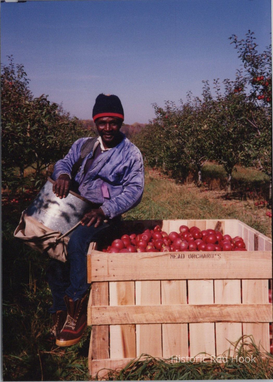 Worker picking apples at Mead Orchards, 1992