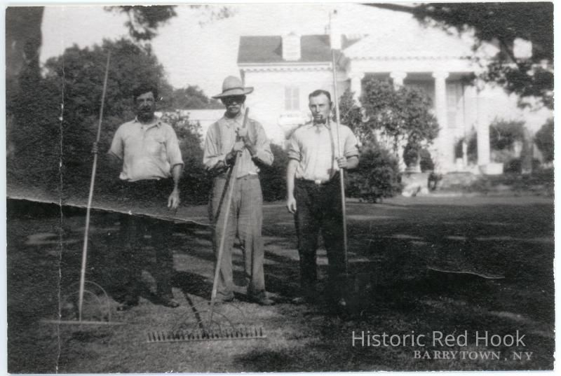 Three men with agricultural tools in front of Sylvania. Barrytown, NY printed on front. Box for stamp on the back.Subject Place