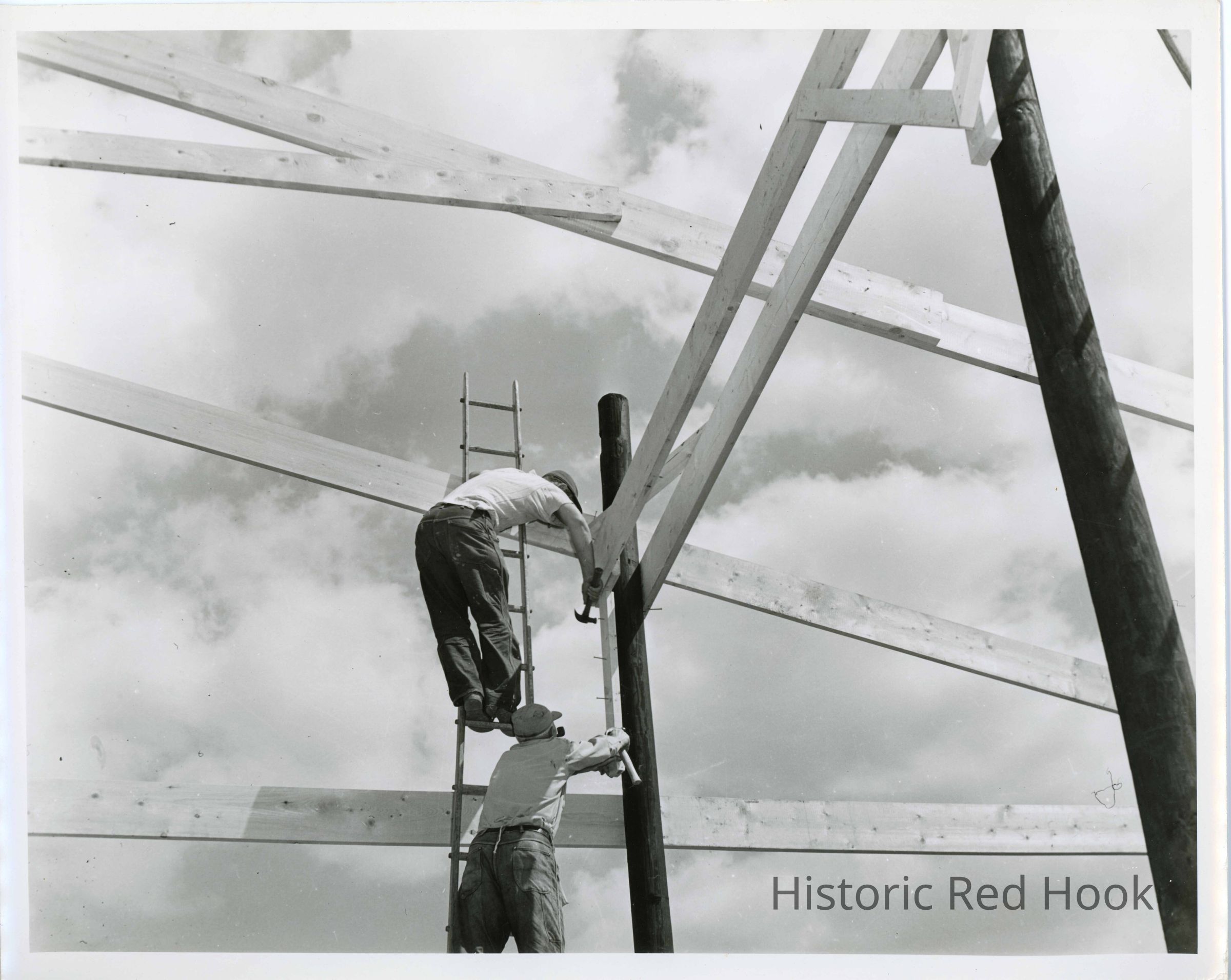 Barn-raising on Thomson property. Workers hammering side support on wooden lift hooked up to Allis-Chalmers tractor.Collection