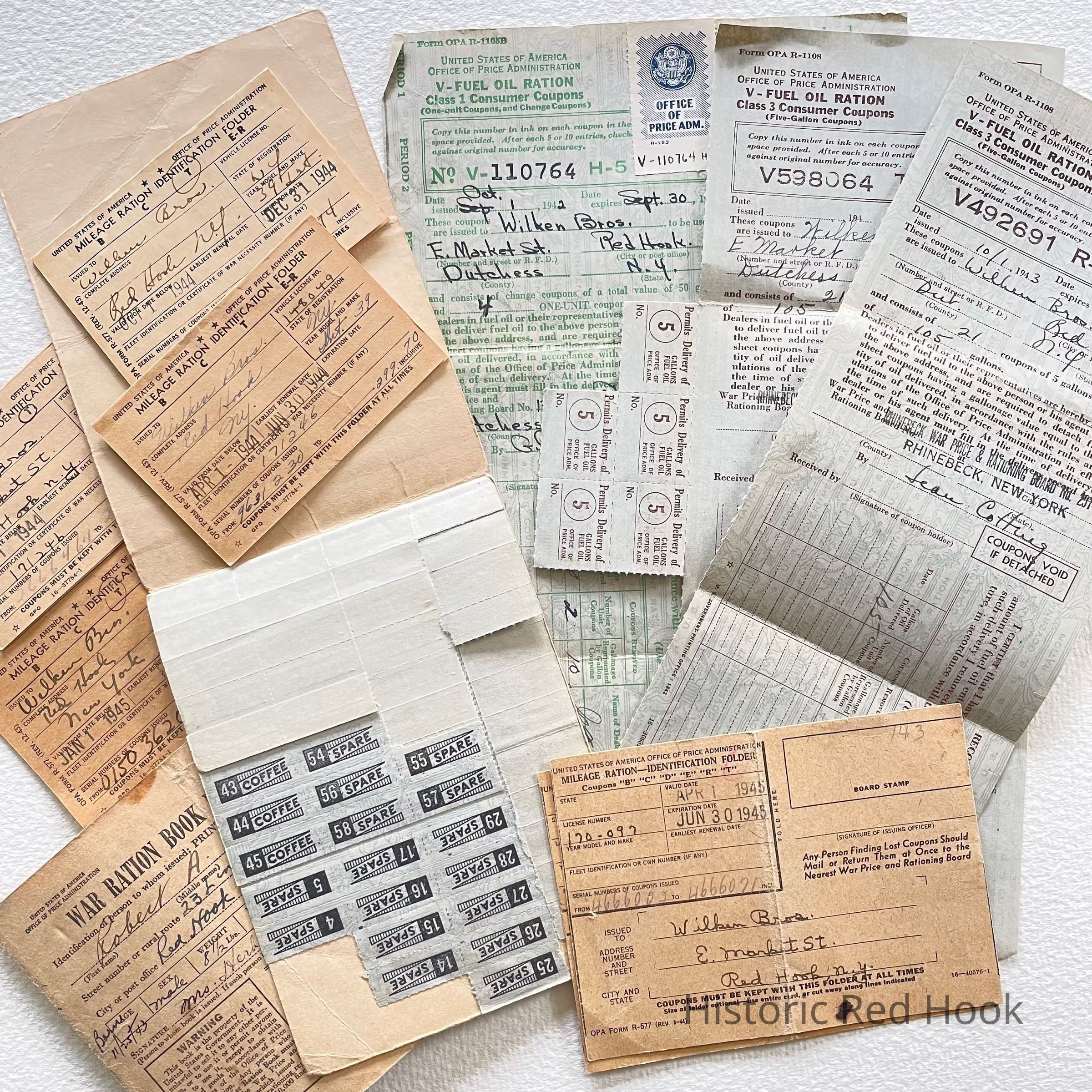 Collection of Ration tickets and books from World War II, used at the Wilken Brothers storeCollection