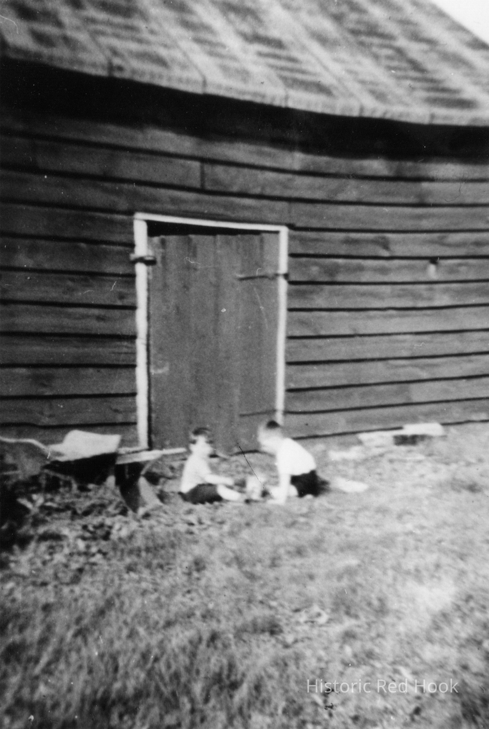 Two children are playing near a wooden shed's door.