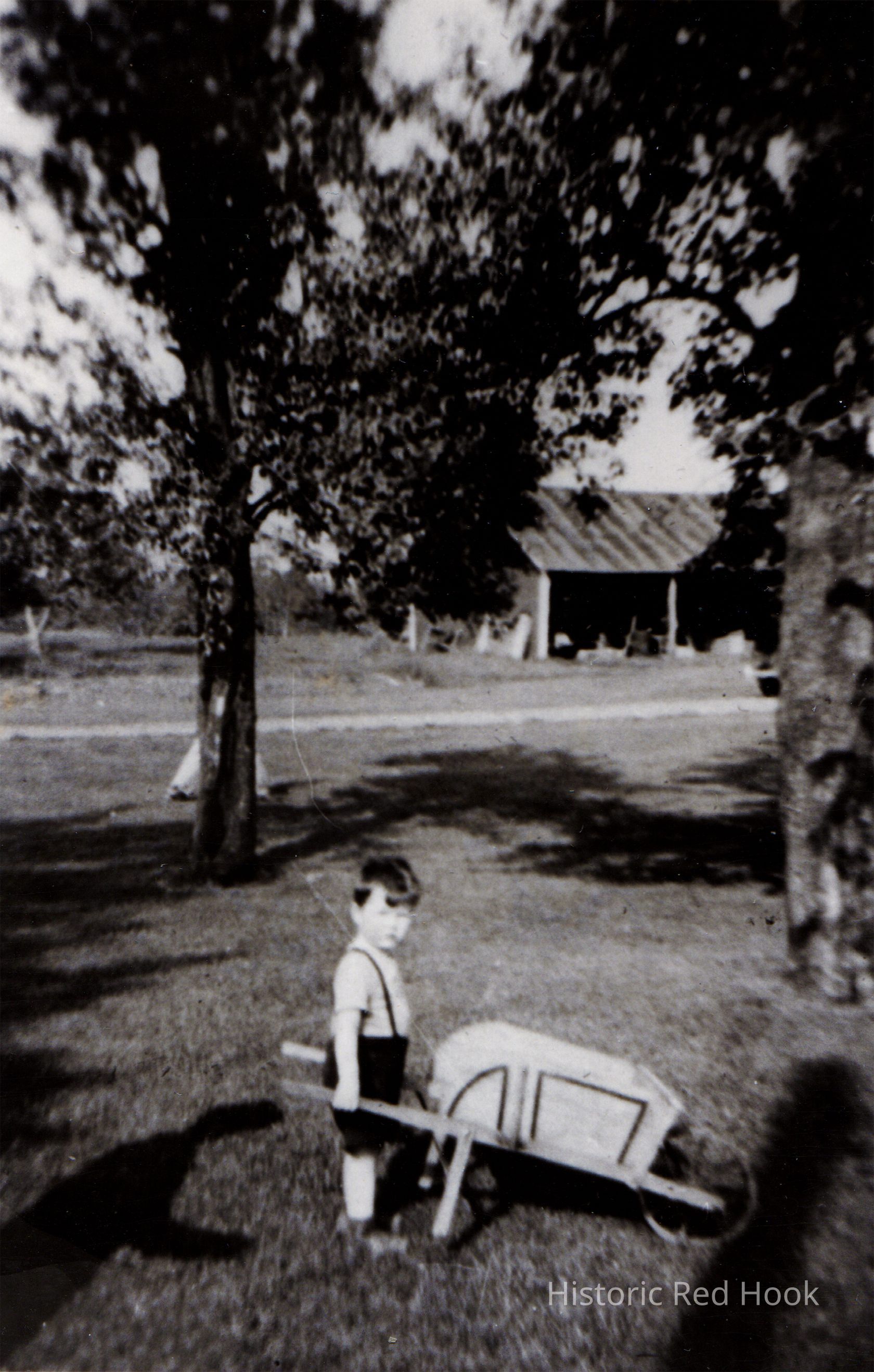 A young child (Bill O'Neill) pulls a toy wagon outdoors near trees.