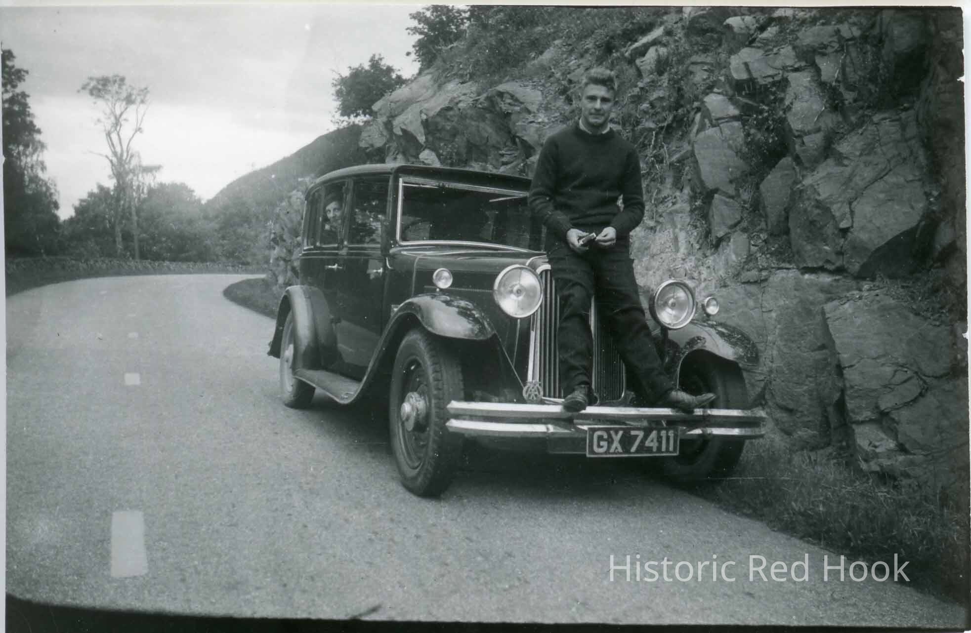 Photograph of a young man standing on the front bumper of a car.