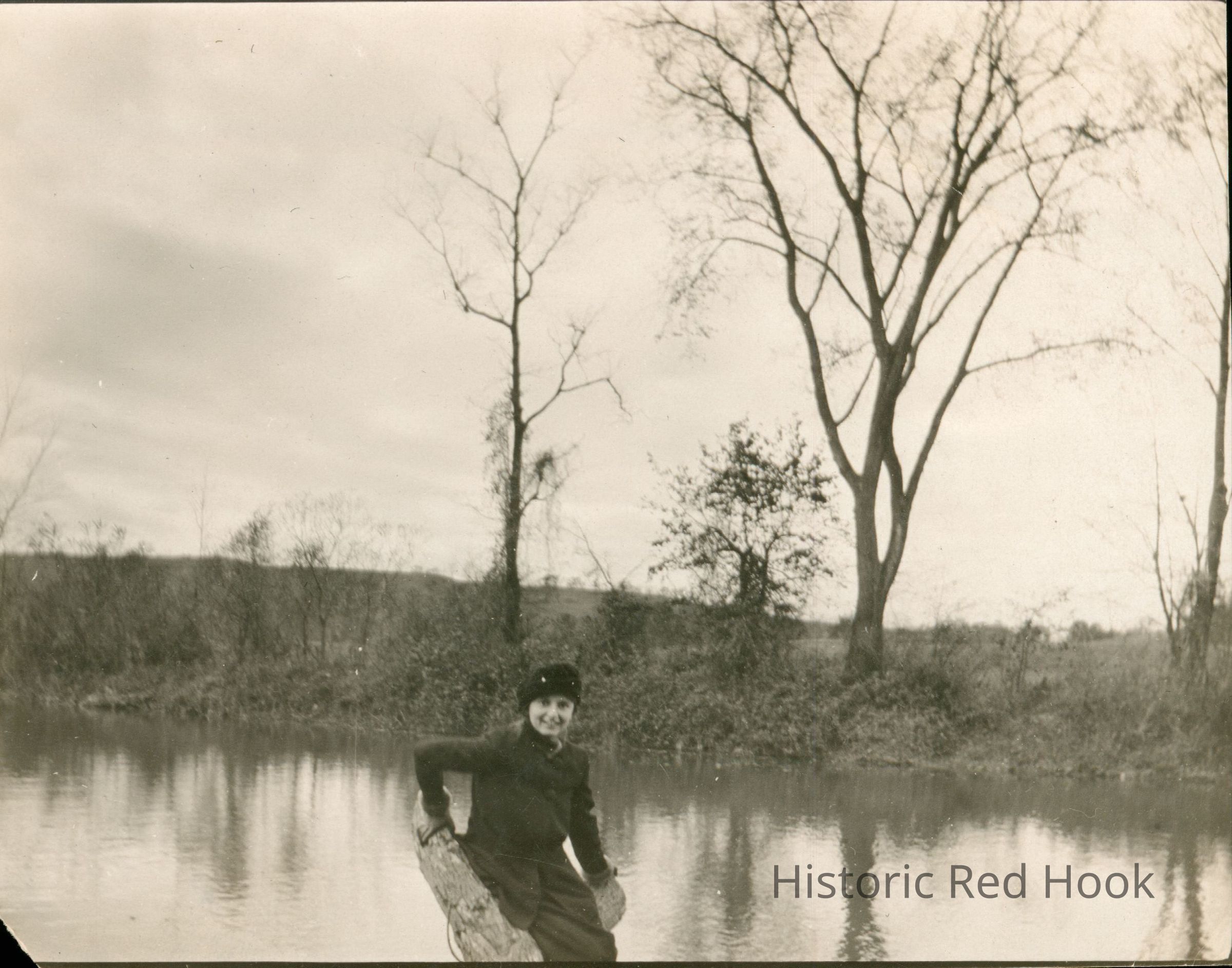 Outdoor photograph taken of a young woman seated outdoors near a pond.