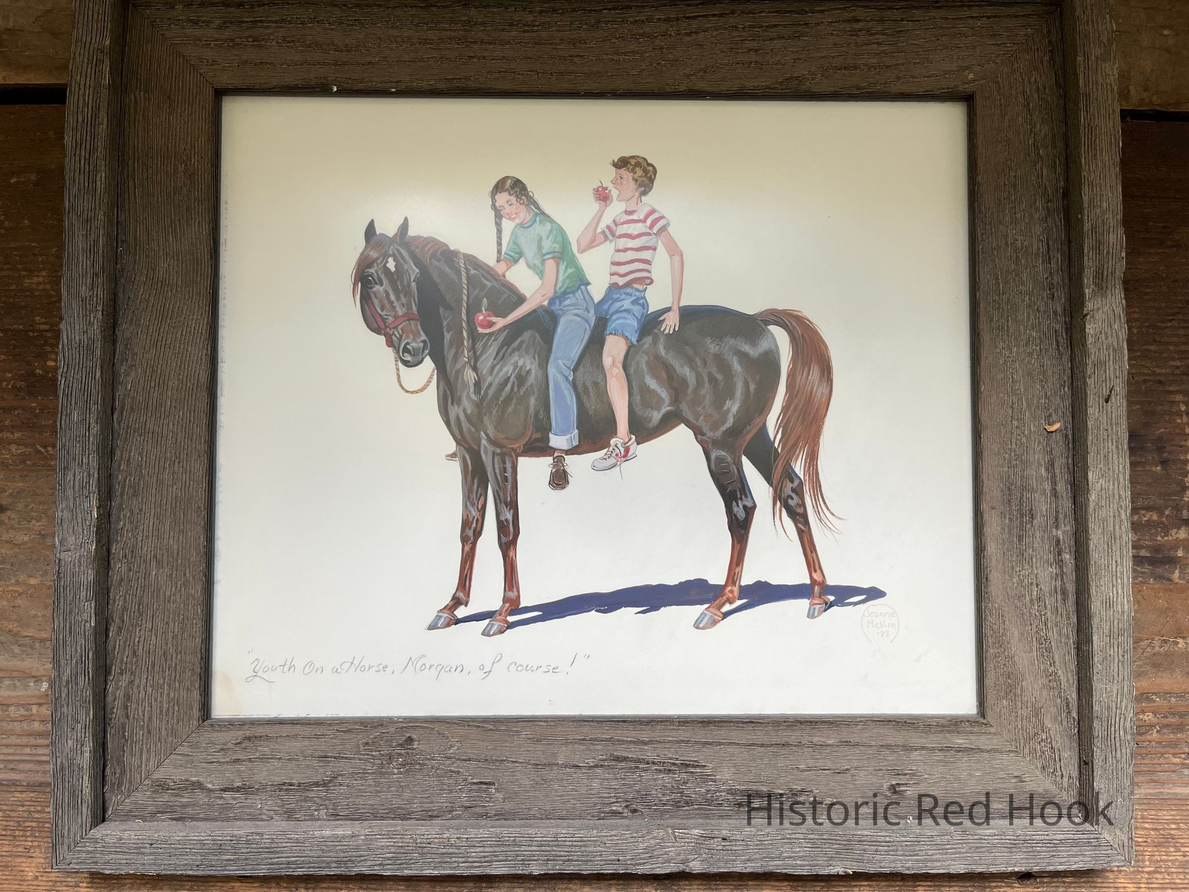 Framed watercolor painting of a horse with a girl and boy riding bareback. The painting is entitled "Youth on a Horse, Morgan, of course!" The story passed along with the painting was that the boy was John Hardeman. Jeanne Mellin was a horse breeder and artist and was married to Fred Herrick, another horse breeder. They were hired by Gordon Voorhis to breed his Morgan horses.Collection