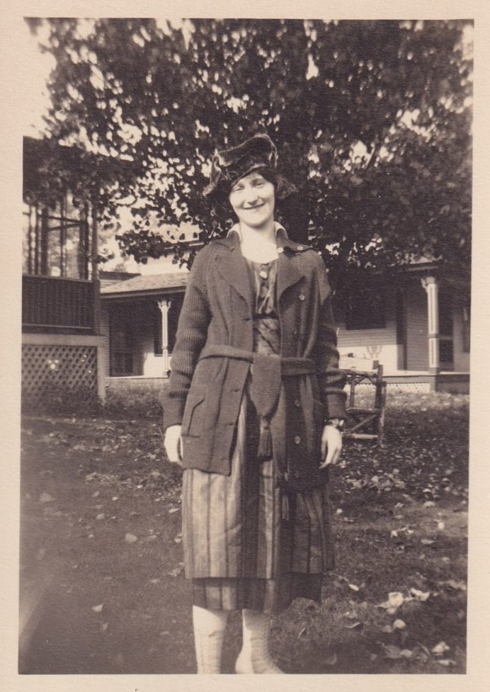 Black-and-White photograph of an unidentified woman standing in front of a house. A portion of a possible cure porch window is visible behind her. The photograph was likely printed by Kollecker's Kodak and Gift Shop.