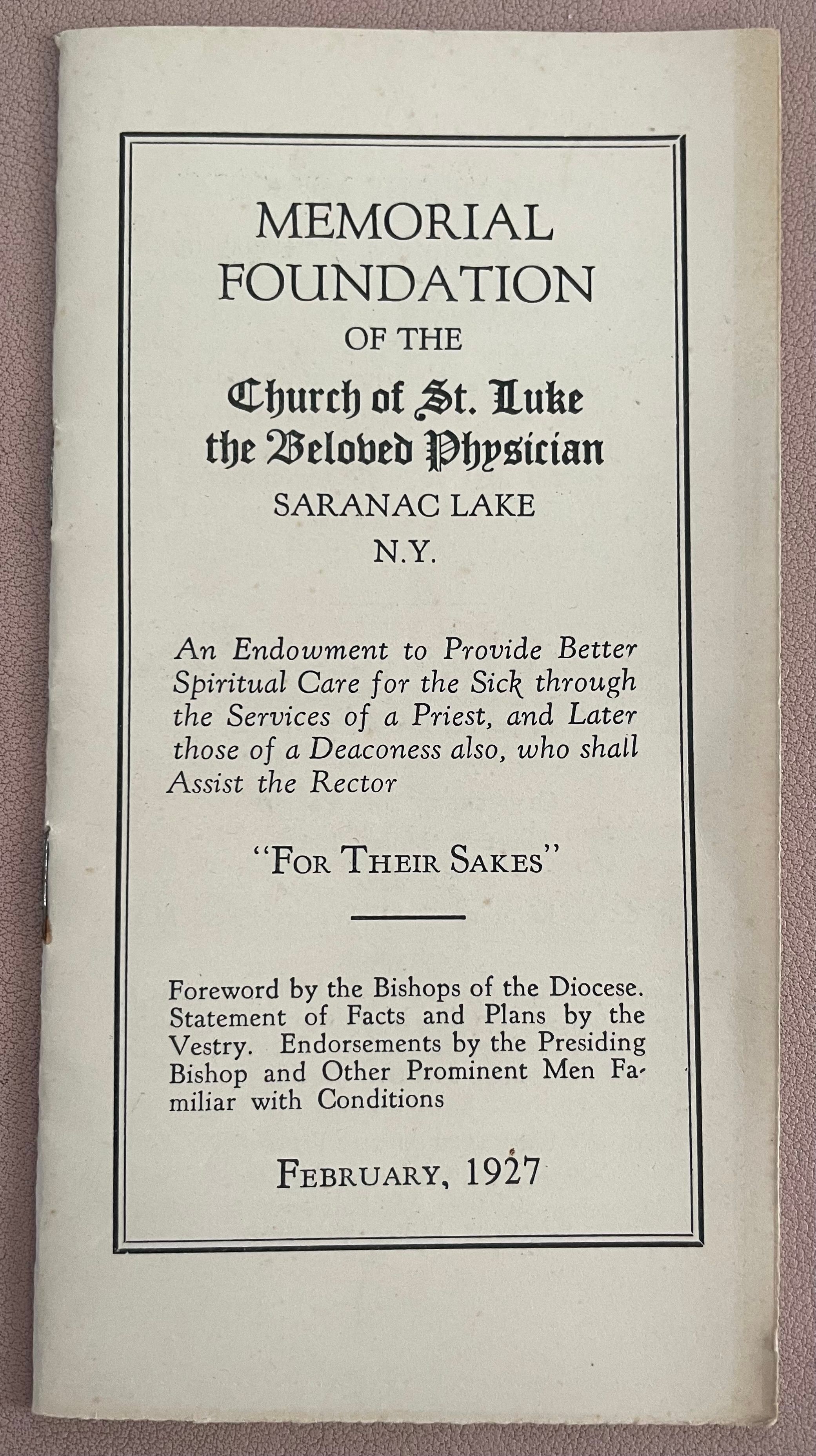 Small pamphlet entitled, "Memorial Foundation of the Church of St. Luke the Beloved Physician, Saranac Lake, N.Y.," printed February 1927. Includes a forward detailing the appeal, facts and plans, and endorsements from various religious figures.Lexicon