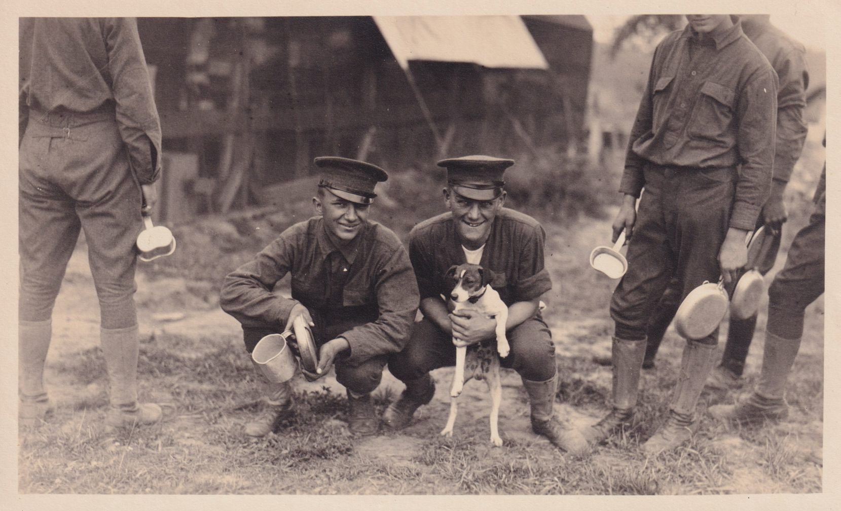 Black-and-White photograph of a two soldiers squatting down outside. One of them is holding a mess kit, and the other is raising a small dog up on its hind legs. There are several soldiers standing in line around them with mess kits. The photograph was likely printed by Kollecker's Kodak and Gift Shop.