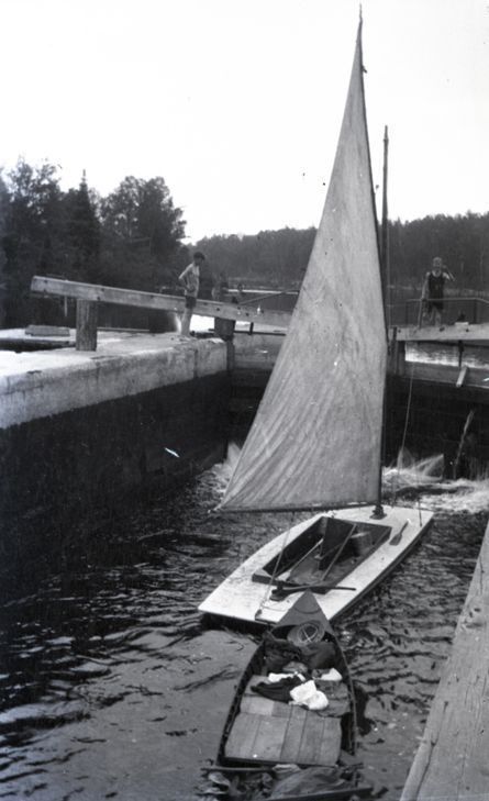 Negative of a small sailboat in a lock on the water. There is also a small rowboat in the lock behind the sailboat. There are two young men standing on the edge of the lock. Most likely taken by Mary Ives Baldwin. This item is not fully cataloged but has been uploaded so the image is publicly available; if you would like us to prioritize cataloging this item, please contact the HSL Collections team.