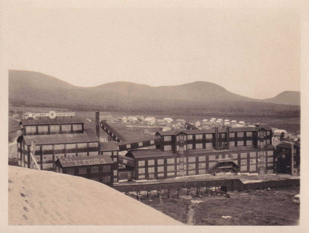 Black-and-White photograph of an unidentified factory, mill, or plant. A large sign above the property reads, "Williams Concentrator." Houses can be seen in the distance. The photograph was likely printed by Kollecker's Kodak and Gift Shop.