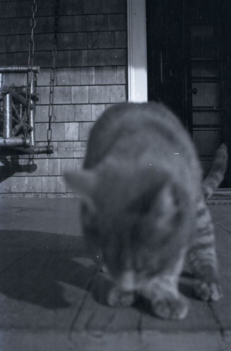 Negative of a cat about to sit down on the porch of the Baldwin House. The open door can be seen behind them. Most likely taken by Mary Ives Baldwin. This item is not fully cataloged but has been uploaded so the image is publicly available; if you would like us to prioritize cataloging this item, please contact the HSL Collections team.