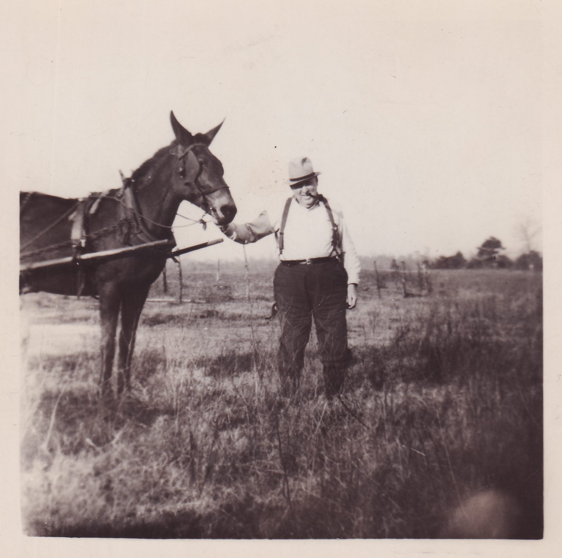 Black-and-White photograph of Ray Burmaster standing in a field, holding the reins of a horse.