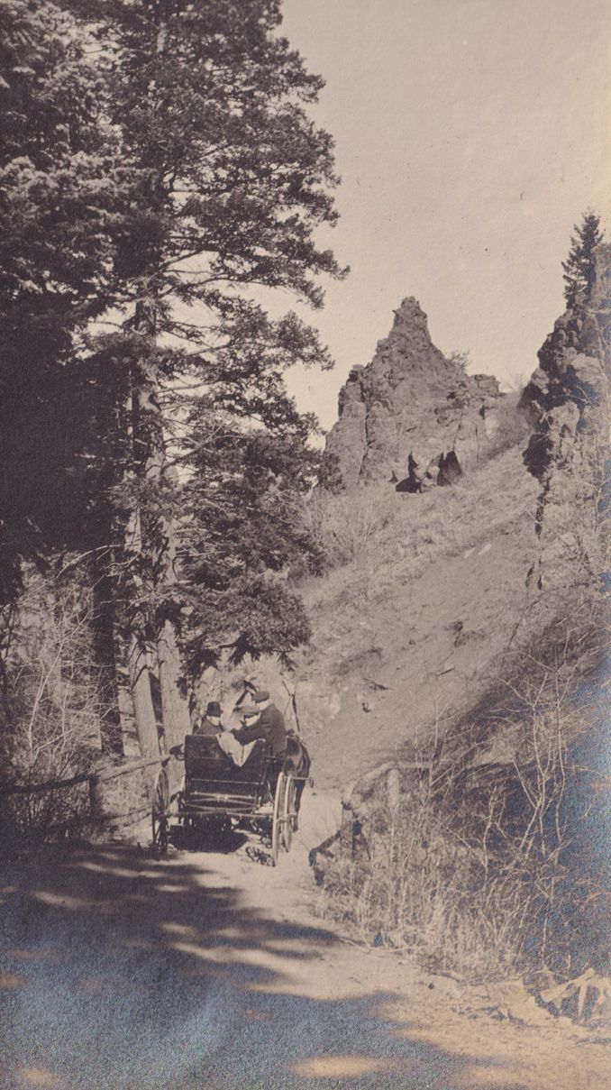 Black-and-white photograph of a horse-drawn buggy driving along a narrow dirt road in a rocky landscape. There are some trees in the area as well.
