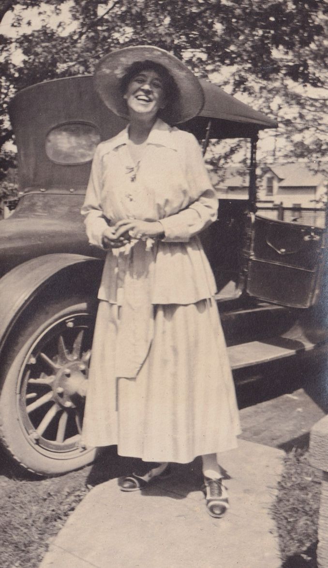 Black-and-white photograph of a woman in a dress wearing a hat standing outside in front of a car with an open passenger door. There are many tree branches and leaves in the sky above the woman and the car.