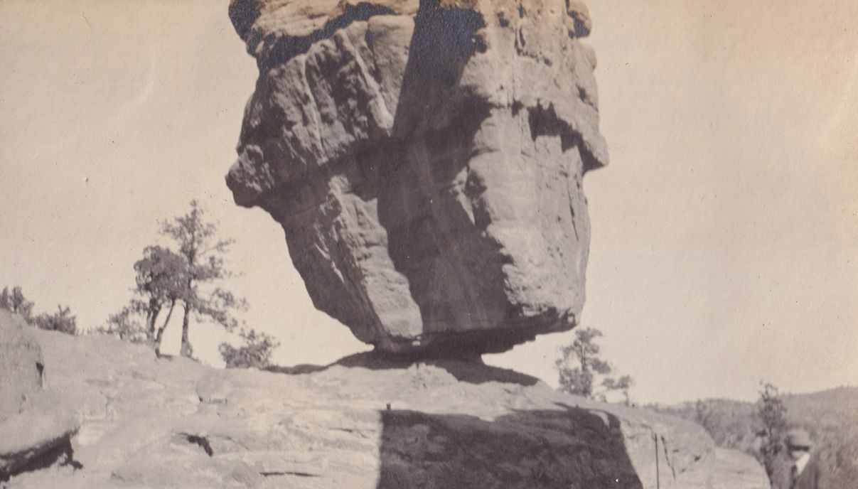 Black-and-white photograph of Balanced Rock at Garden of the Gods in Colorado Springs, Colorado. There is a large rock balanced upright on one corner. There is a blurred person in the bottom right corner of the photograph.