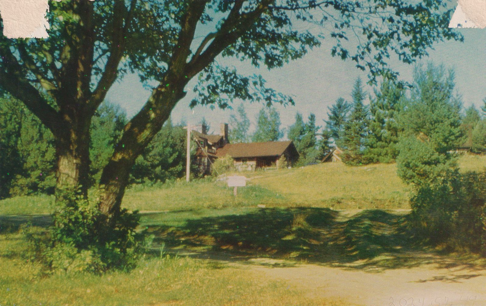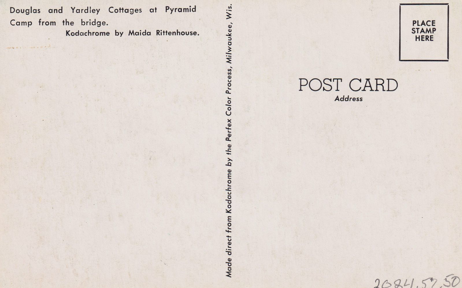 Color postcard showing Douglas and Yardley Cottages at Pyramid Camp (AKA Bartlett Carry Club), seen from a distance. Printed caption on reverse reads, "Douglas and Yardley Cottages at Pyramid Camp From the Bridge." Photochrome by Maida Rittenhouse. Printed by the Perfex Color Process, Milwaukee. Unused, divided back.Subject Place