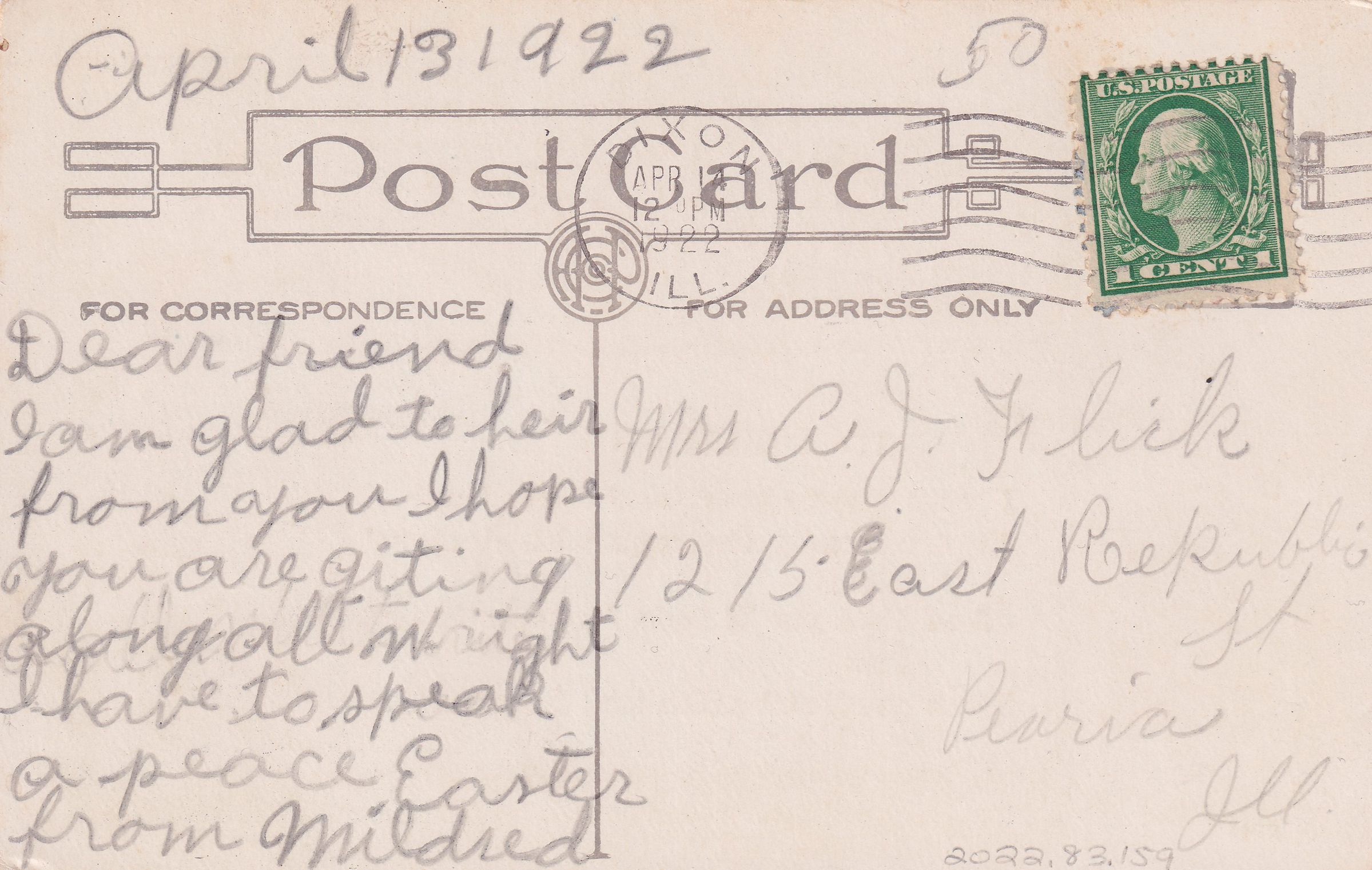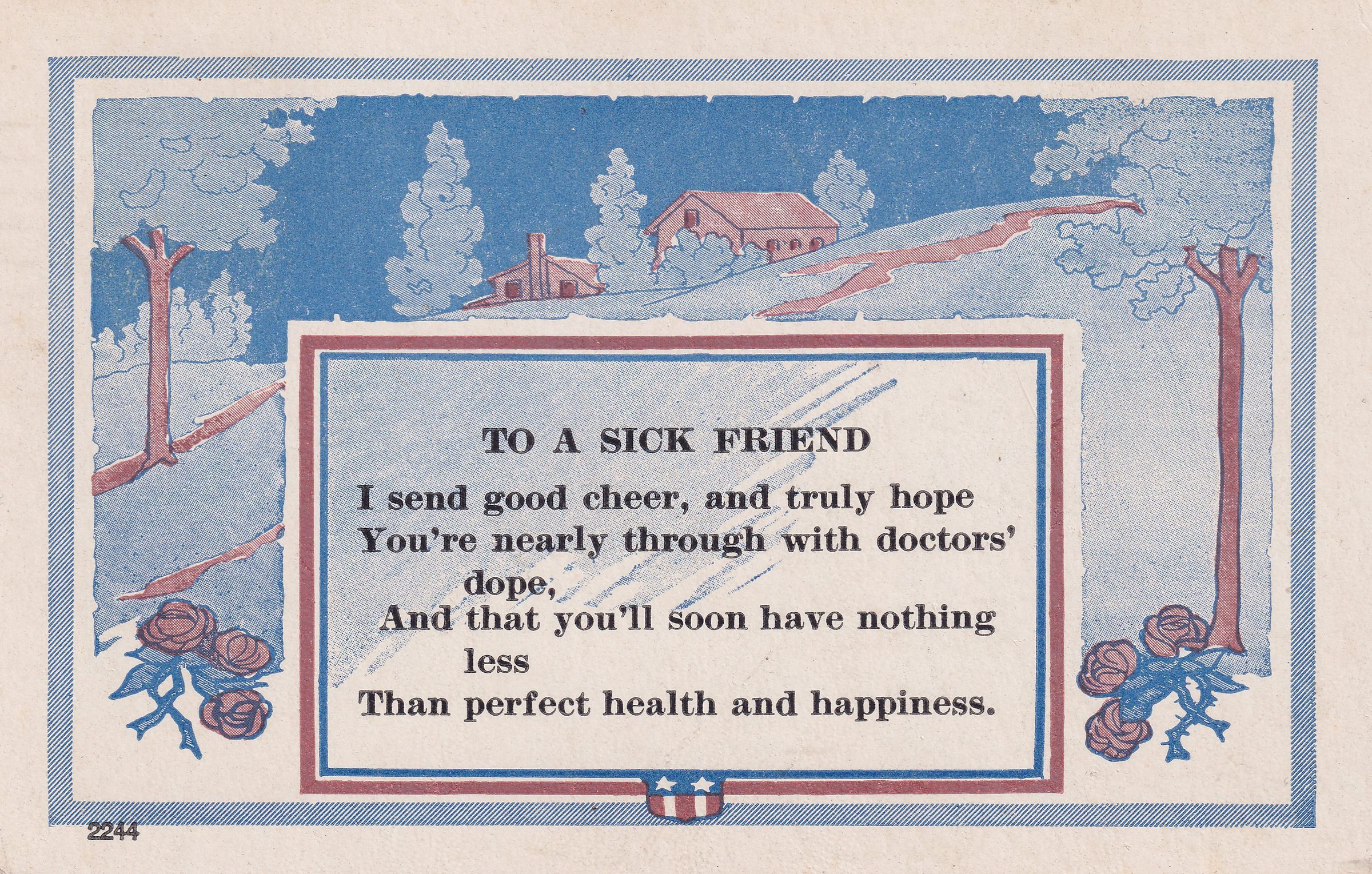 Color postcard with an illiustration of a small house on a hill. Printed on front is, “To a Sick Friend, I send good cheer, and truly hope, You’re nearly through with doctors’ and dope. And that you’ll soon have nothing less, than perfect health and happiness.”Collection