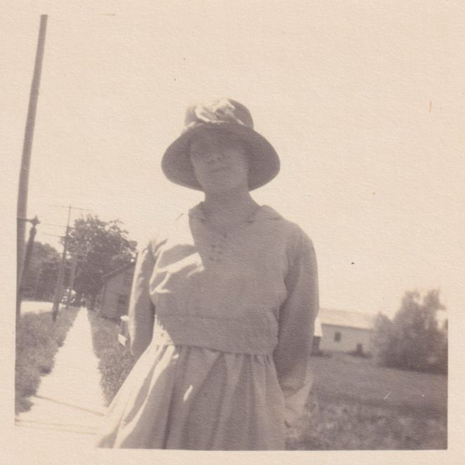 Black-and-White photograph of an unidentified woman standing outdoors. The photograph was likely printed by Kollecker's Kodak and Gift Shop.