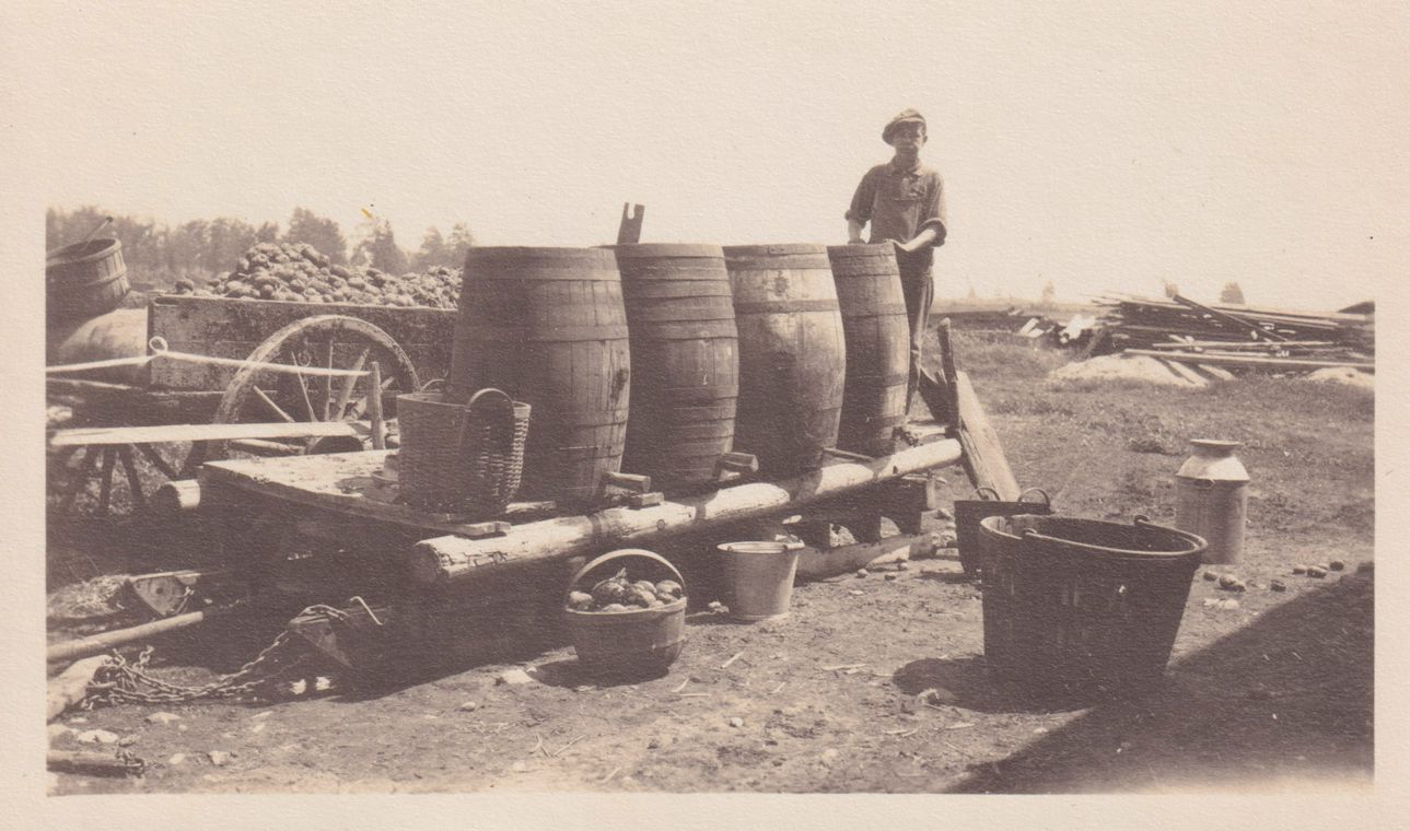Black-and-White photograph of a man standing on a wagon next to several barrels. There are piles of potatoes in a wagon behind him. The photograph was likely printed by Kollecker's Kodak and Gift Shop. [Note: this is the same photograph as 2024.2.181.]