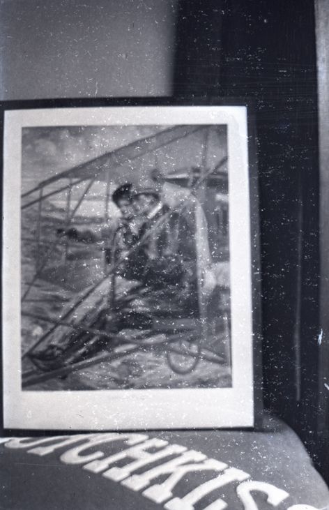 Negative of a framed photo or illustration of a man and woman in a glider. The frame is resting on top of a Hotchkiss blanket or sweater. Most likely taken by Mary Ives Baldwin. This item is not fully cataloged but has been uploaded so the image is publicly available; if you would like us to prioritize cataloging this item, please contact the HSL Collections team.