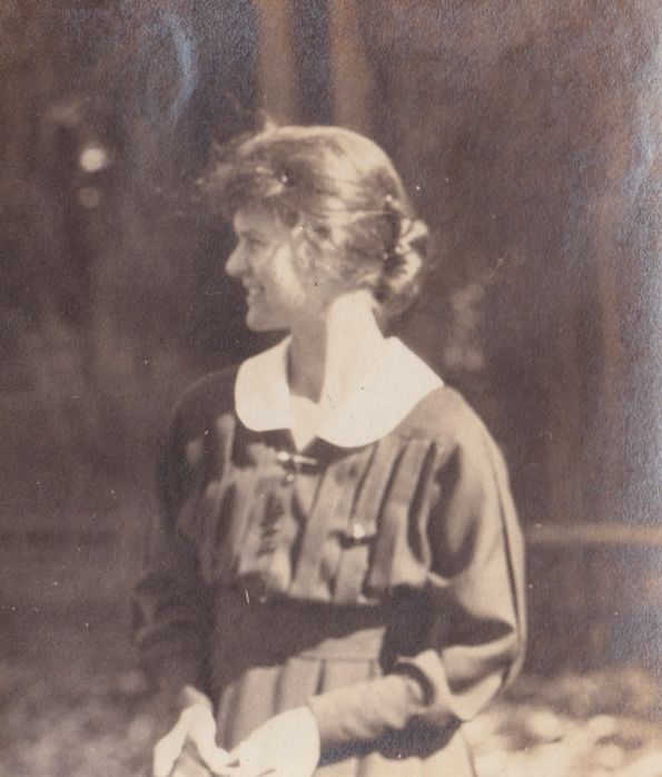 Black-and-white photograph of a woman standing outside and looking to her right while smiling.