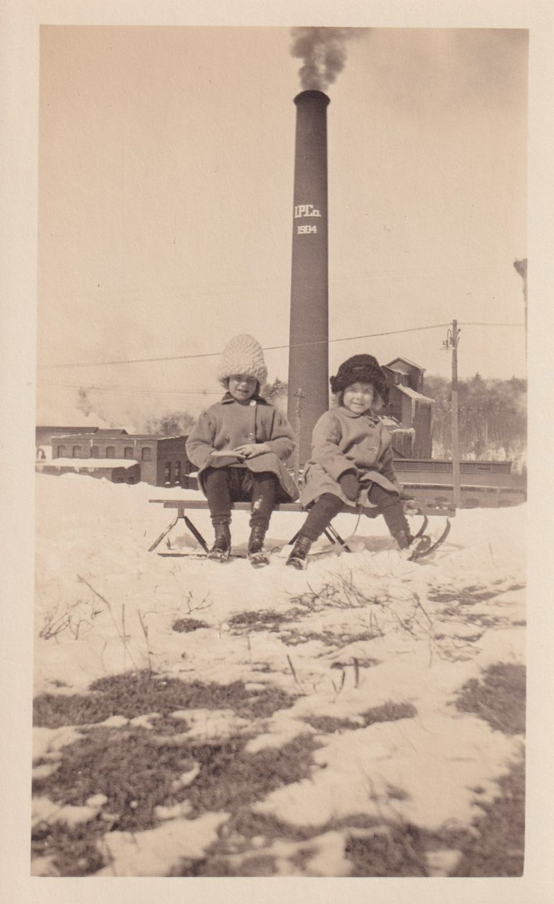 Black-and-White photograph of two unidentified children sitting on a sled. There is an industrial building with a large smokestack behind them. The smokestack reads, "LP. Co. 1904." The photograph was likely printed by Kollecker's Kodak and Gift Shop.
