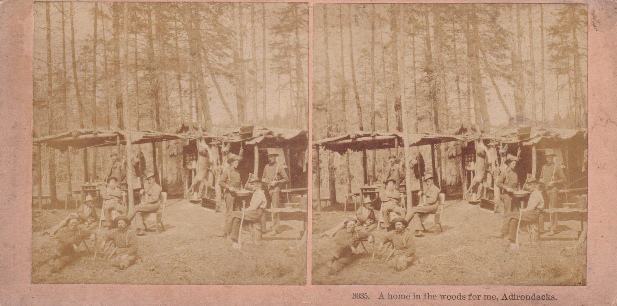 Black-and-White stereoview photograph of a group of guides/hunters sitting around a camp. Several deer are strung up in the campsite. Printed caption on backing reads, "A Home in the Woods for Me, Adirondacks." Photograph by Kilburn Brothers, Littleton, NH. Mounted on tan cardboard backing.Photograph Details