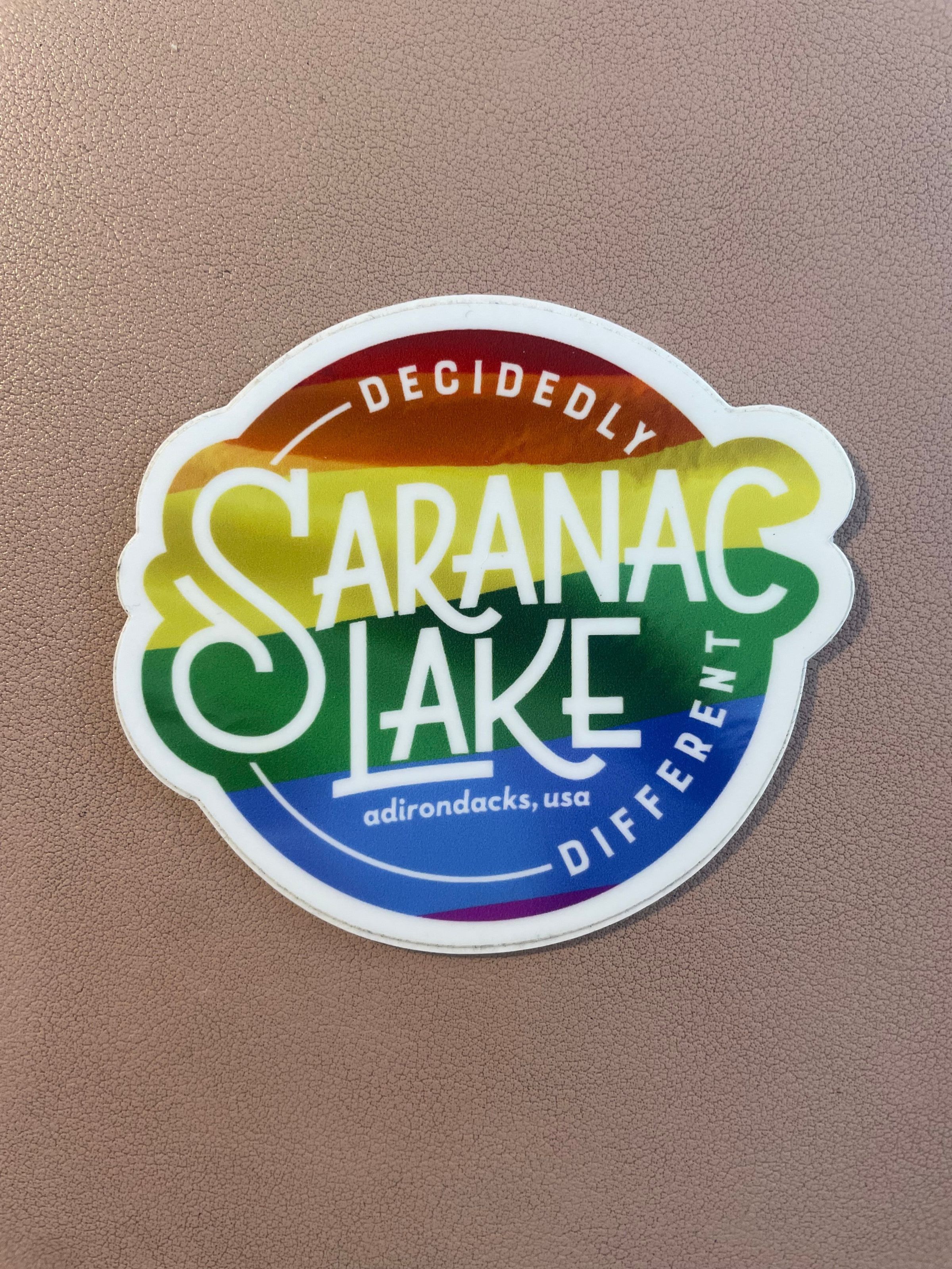 Sticker from Tri-Lakes Pride, 2023. Reads, "Saranac Lake - Decidedly Different," with logo rendered in rainbow theme.