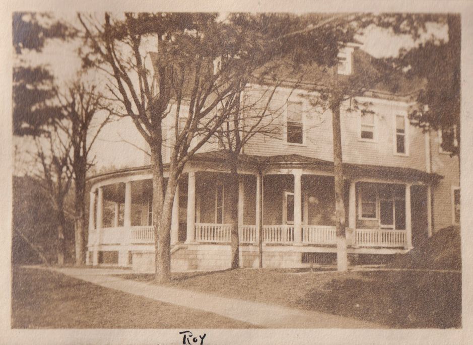 Black-and-white photograph of a two story house with a large first floor porch. "Roy" is written in ink beneath the photograph.
