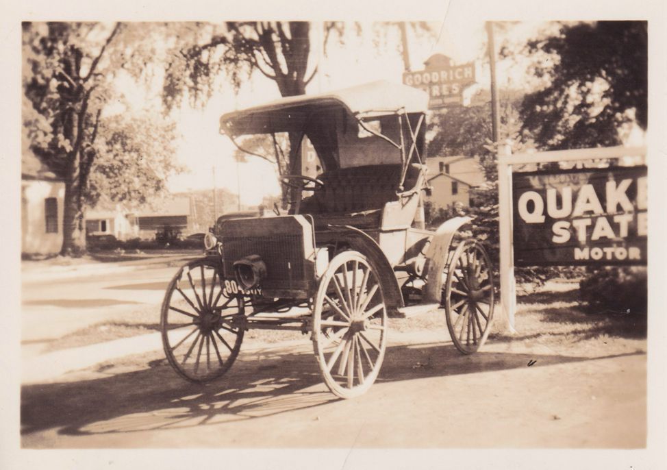 Black-and-White photograph of an early automobile parked next to a Quaker State Motor sign. A large Goodrich Tires sign can be seen behind the car. Photograph was likely printed by Kollecker's Kodak and Gift Shop.