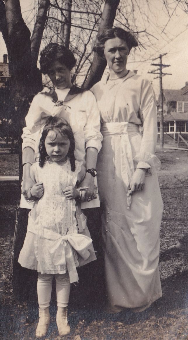 Black-and-white photograph of two women and a girl standing together outside. A cure cottage can be seen in the distance behind them.