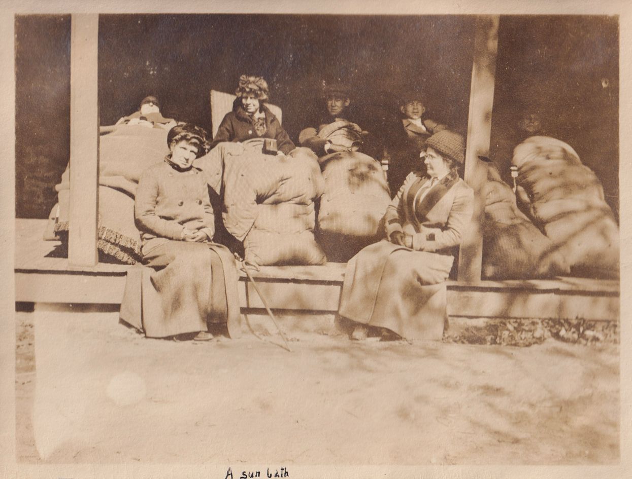 Black-and-white photograph of seven patients sitting on a porch, with their chairs pulled to the edge of the structure so they can sit in the sun. Most of them have blankets as well. "A sun bath" is written in ink beneath the photograph.