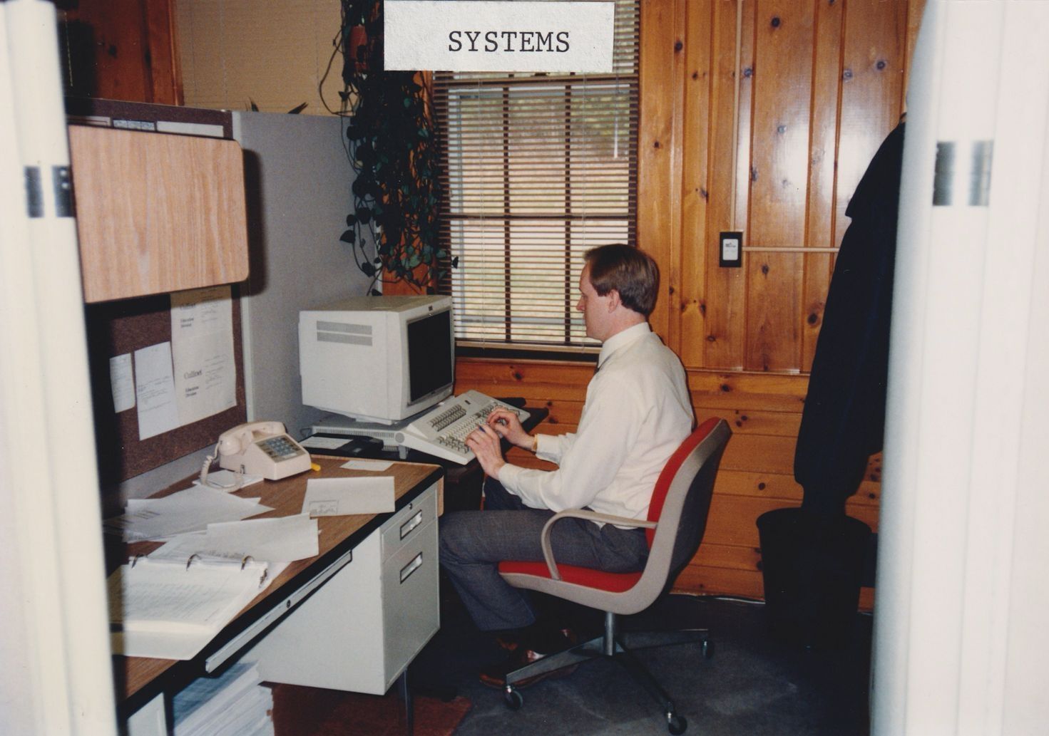 Color photograph of a man at a desk that takes up the whole wall of the small office he is sitting in. He is working at a computer. There is a label affixed to the front of the photograph that has "Systems" typewritten on it. This photograph is from an album of photographs taken at the American Management Association.